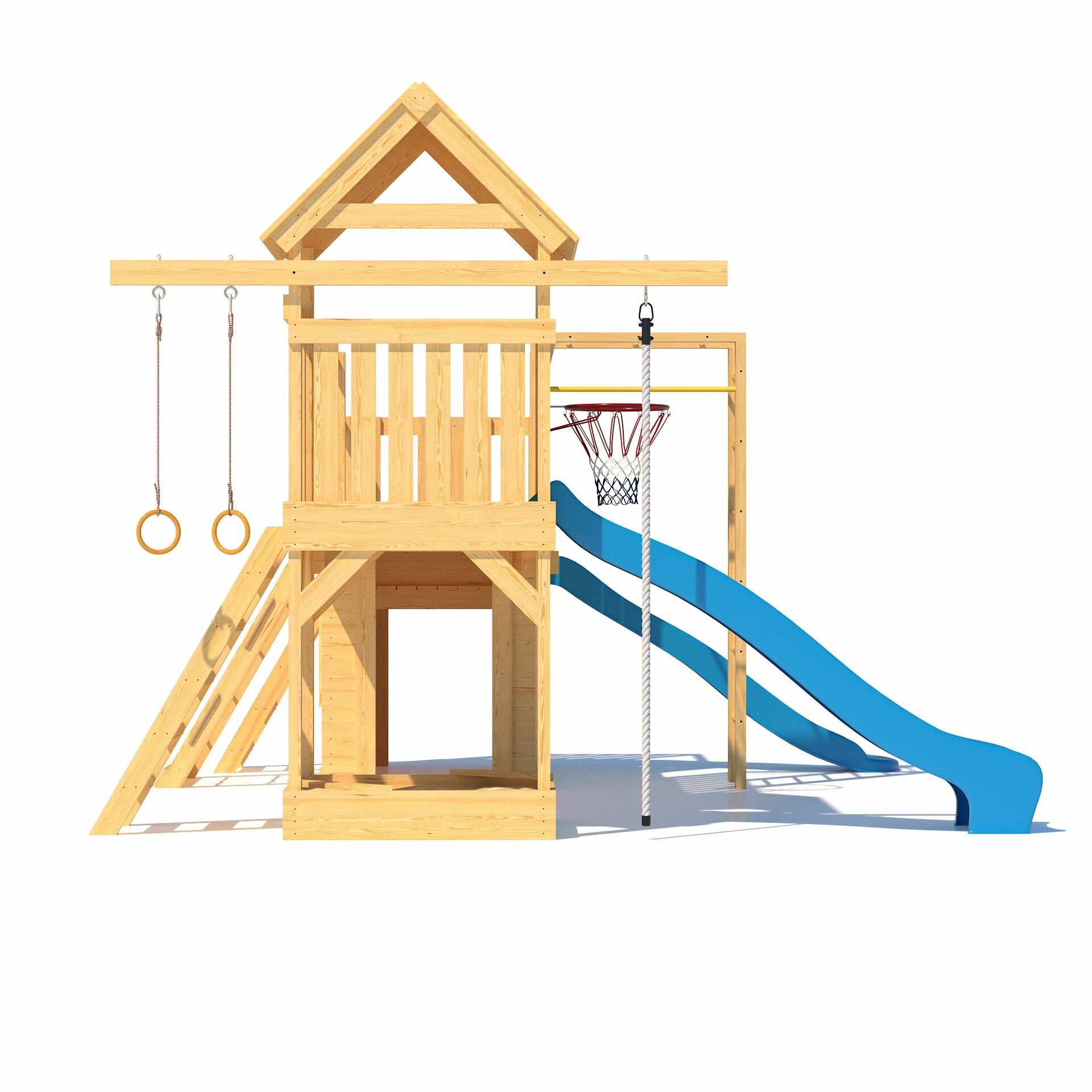 | В комплекте | баскетбольное кольцо, гимнастические кольца, горка, домик, канат, канатный лаз, лестница, мостик, песочница, рукоход, сетка для лазания |