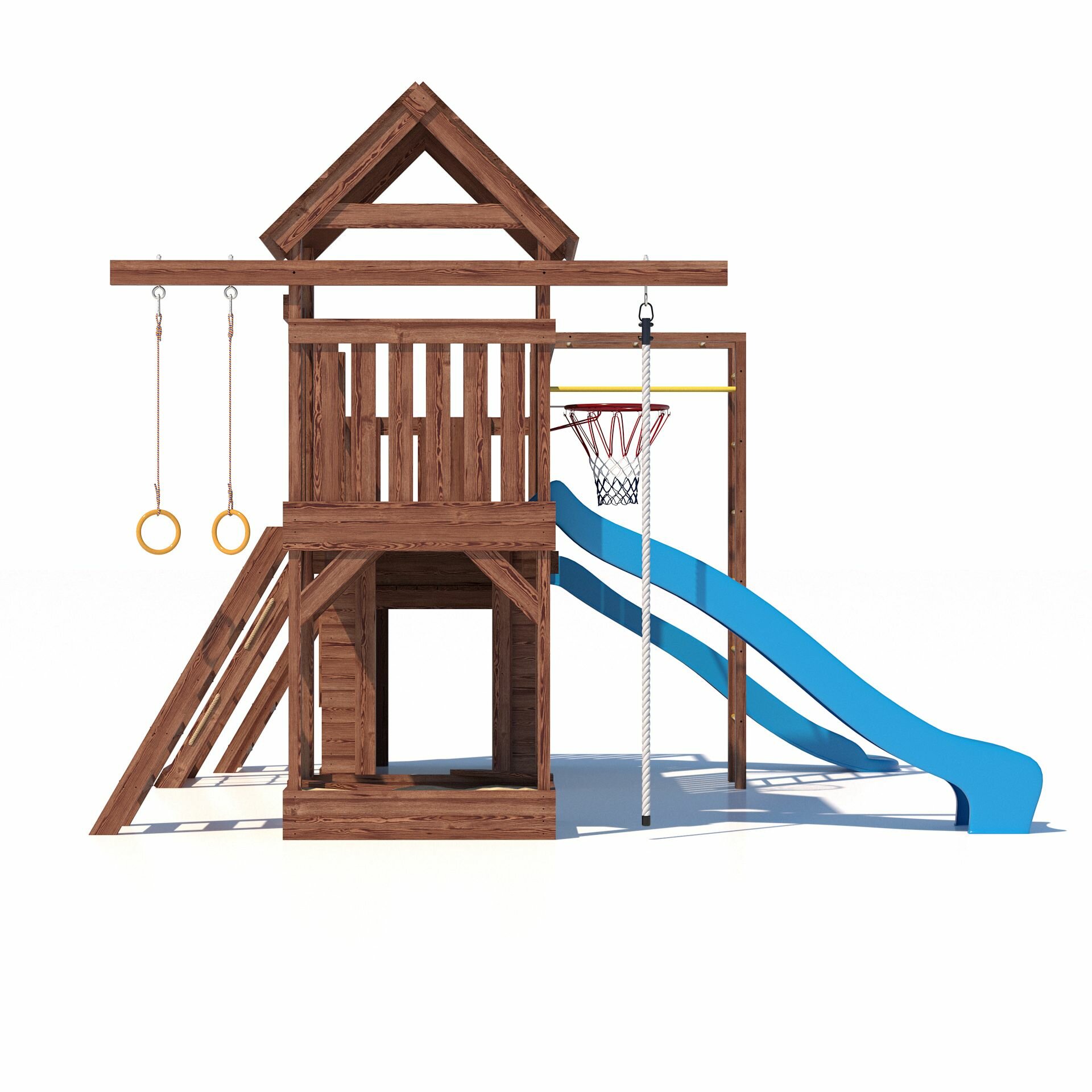 | В комплекте | баскетбольное кольцо, гимнастические кольца, горка, домик, канат, канатный лаз, лестница, мостик, песочница, рукоход, сетка для лазания |