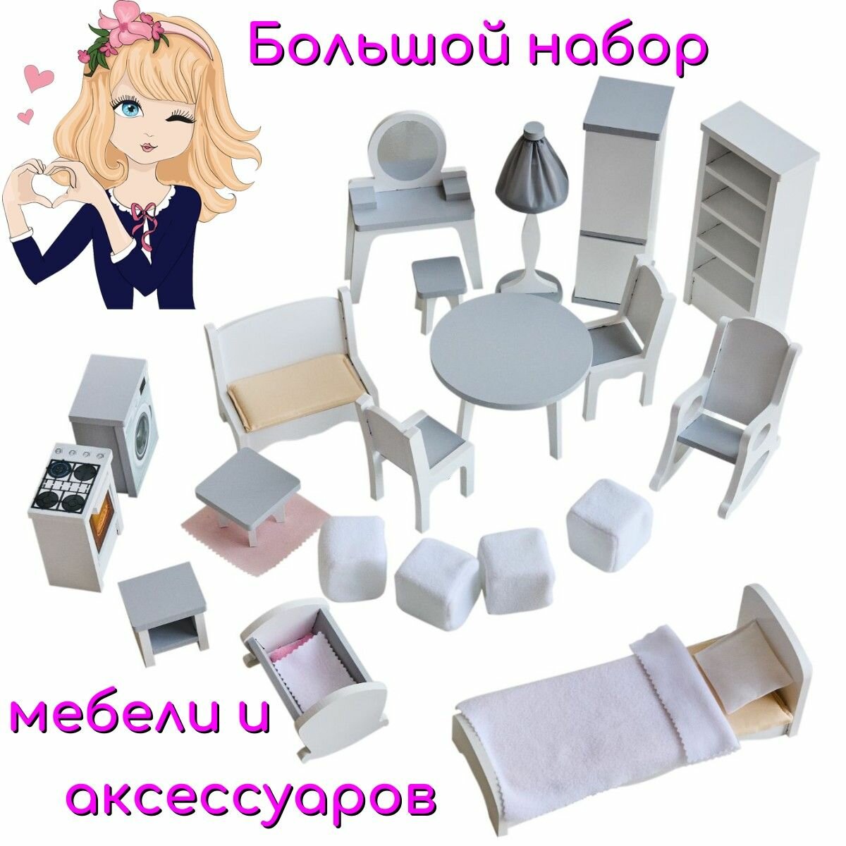 | Дополнительная информация | куклы в комплект не входят; торшер с лампочкой светится, съемный домик - 28 х 28 х 33 см, 27 предметов мебели и аксессуаров, текстиль в комплекте; дверцы мебели открываются, кресло-качалка и люлька – качаются, текстиль снимается |