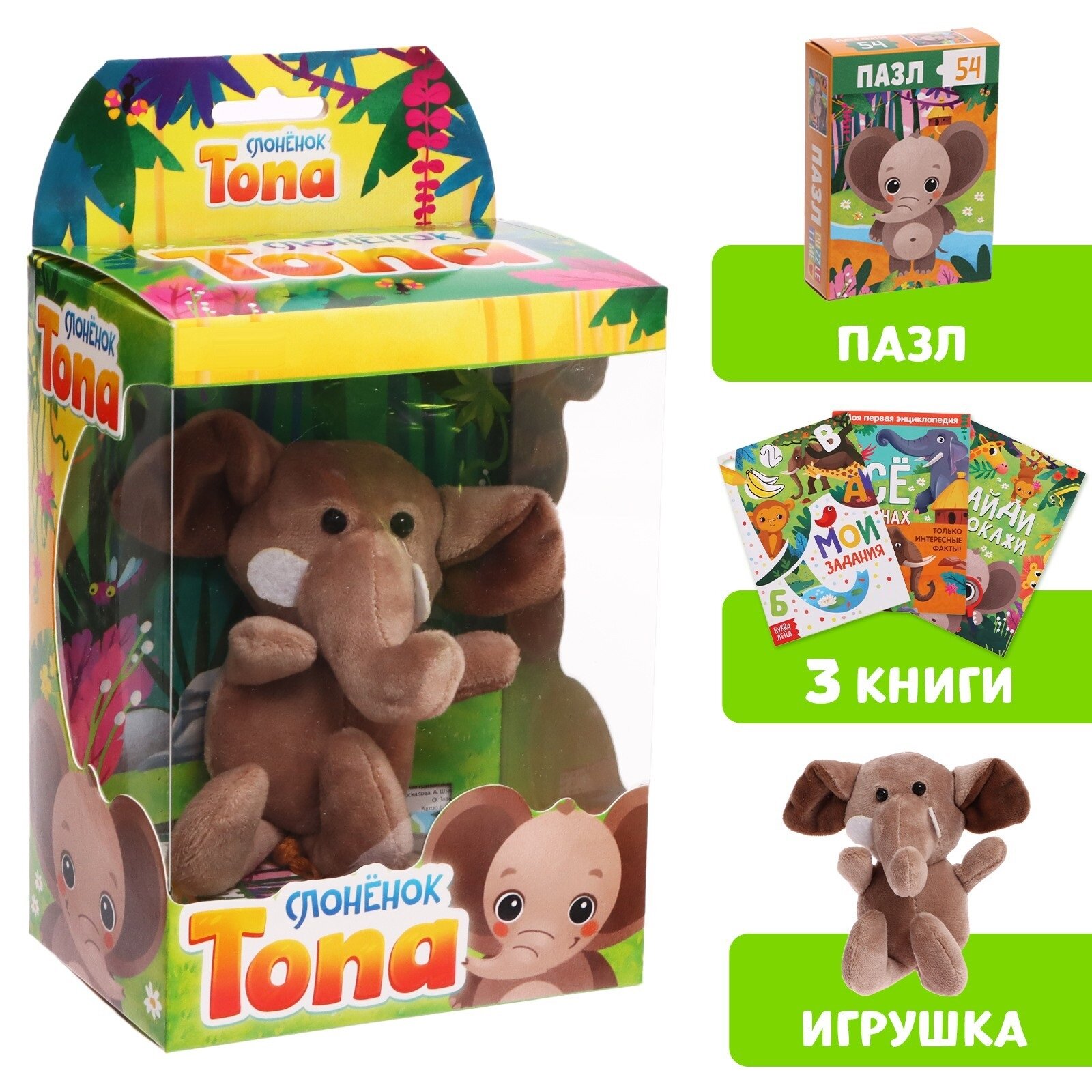 10 цен на Набор 3 в 1 "Слонёнок Топа": 3 книги (задания, интересные факты, головоломки), пазл, мягкая игрушка, Буква-Ленд