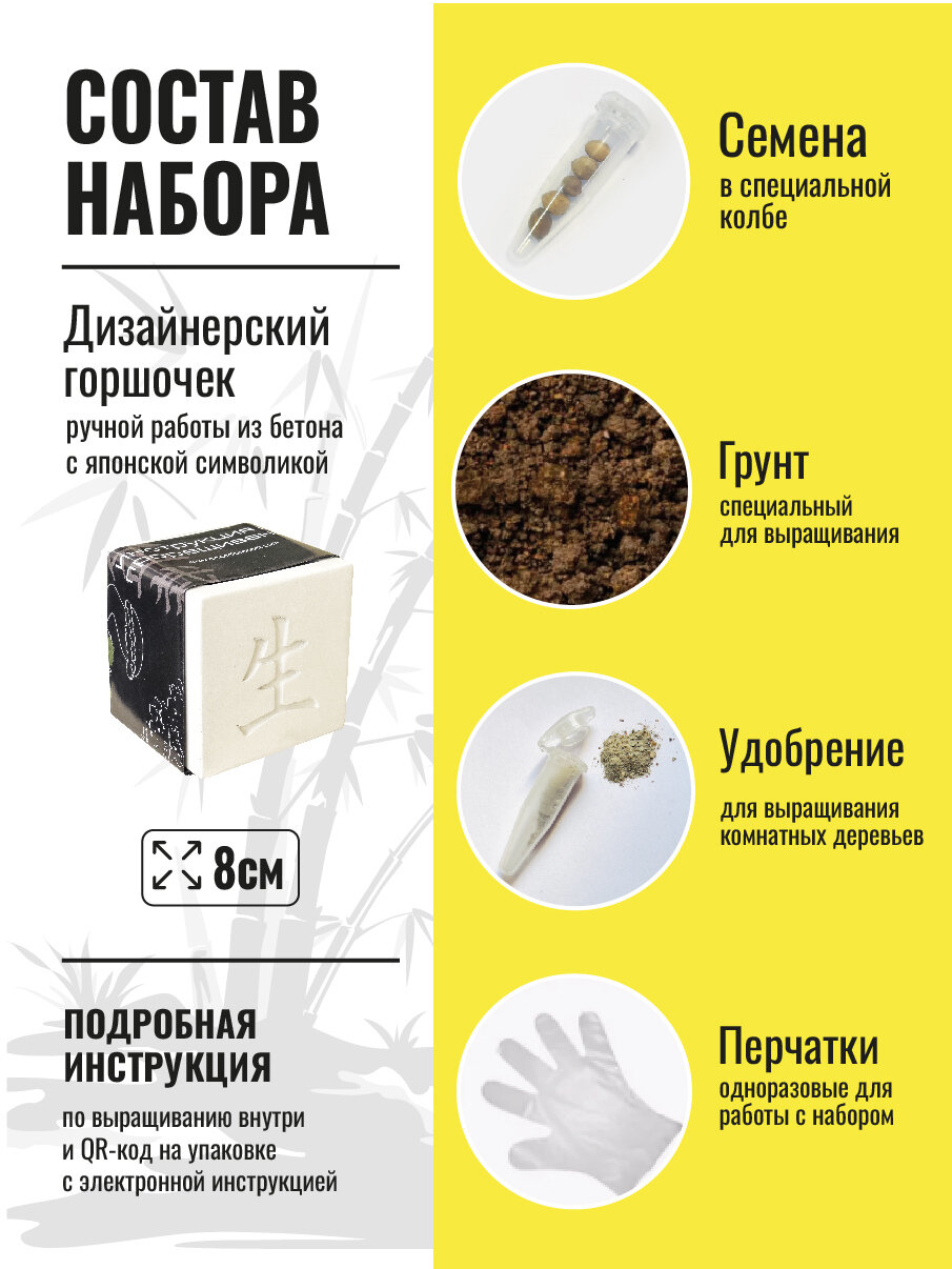 | Комплектация | подарочная коробка, кашпо из бетона, семена в защитной капсуле, умное удобрение, специальный грунт, пара одноразовых перчаток, инструкция по выращивания семян |