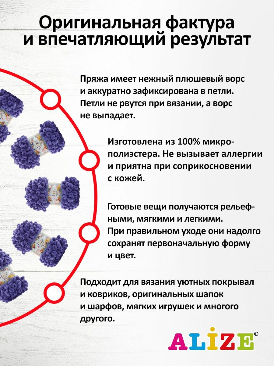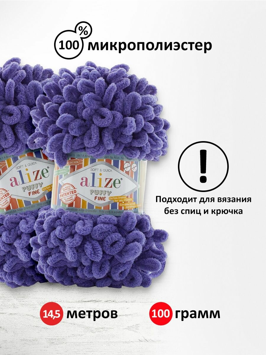 Пряжа для вязания руками с готовыми петлями ALIZE 'Puffy Fine' 100г, 14,5м (851 сиреневый), 5 мотков информация: