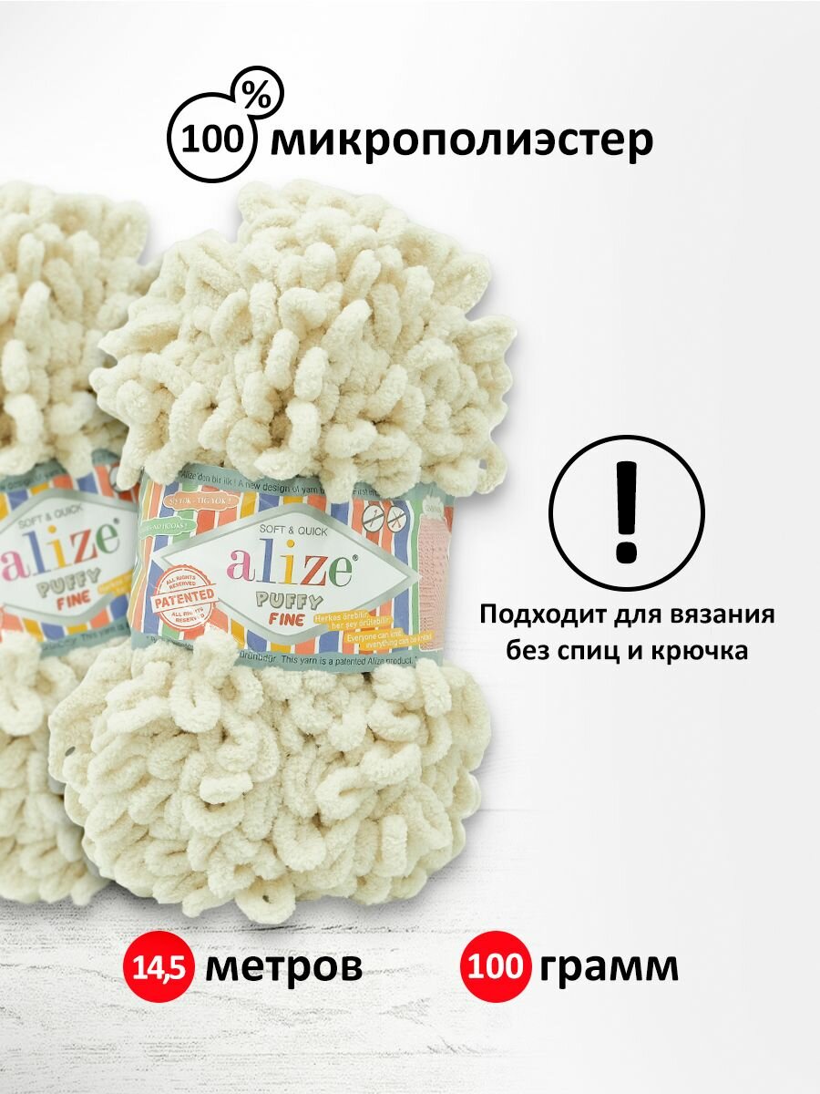 Пряжа для вязания руками с готовыми петлями ALIZE 'Puffy Fine' 100г, 14,5м (599 слоновая кость), 5 мотков информация: