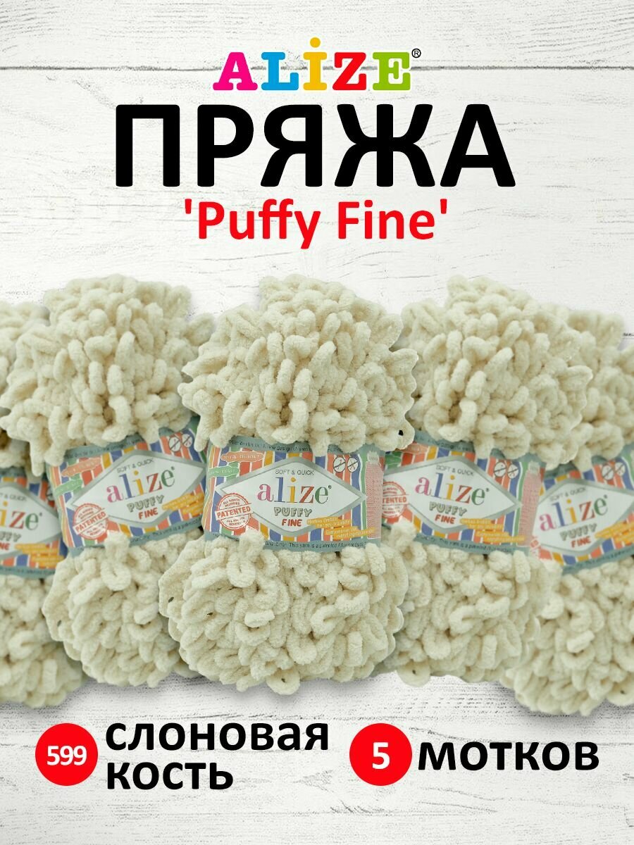 Пряжа плюшевая Alize Puffy Fine (Пуффи Файн) - 5 мотков 599 слоновая кость, для вязания рукми, маленькие петельки (2см), 100г 14м