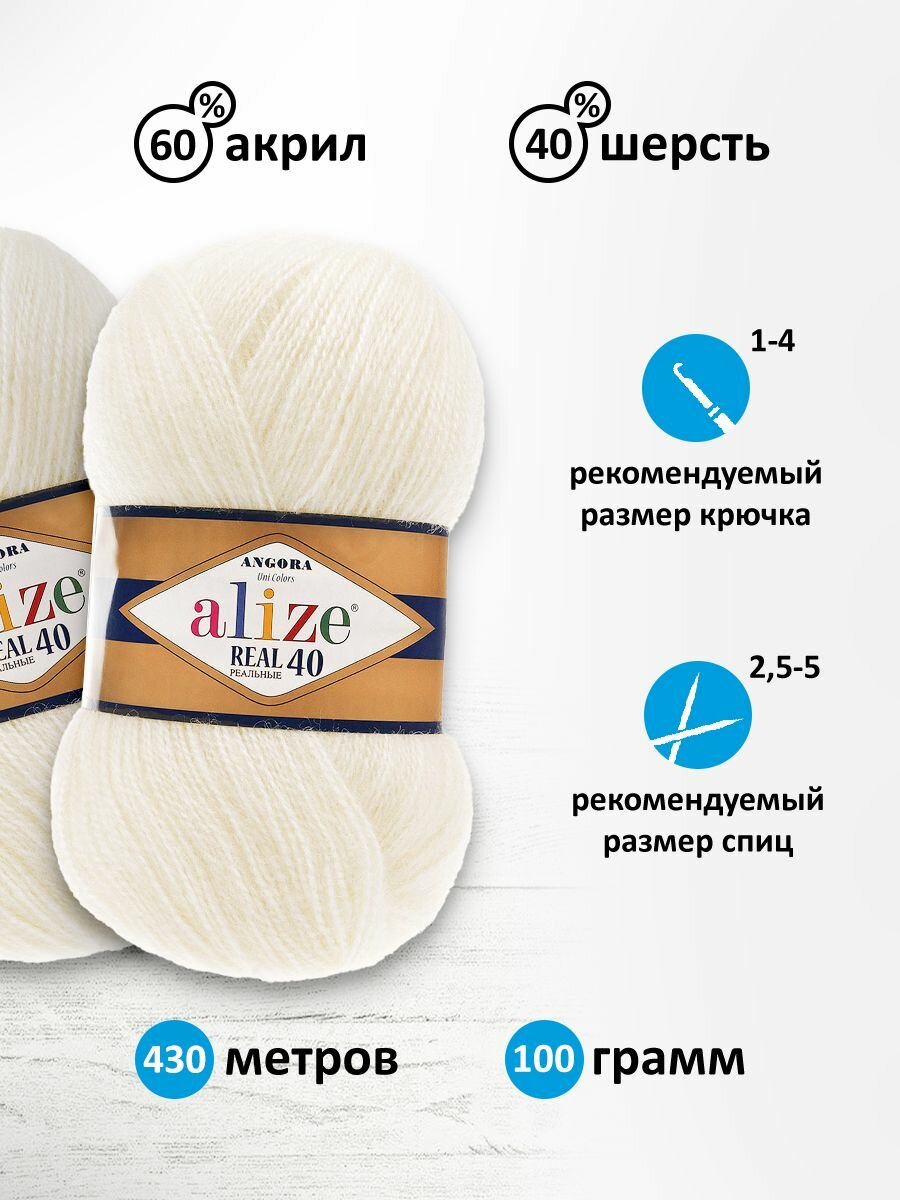 Пряжа ALIZE ANGORA REAL 40, кремовый - 01, 40% шерсть, 60% акрил, 5 мотков, 100 г, 430 м. 1 494 ₽