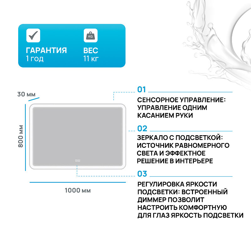 Зеркало настенное для ванной КерамаМане 70*100 см с холодной подсветкой 6000 К с сенсорной кнопкой