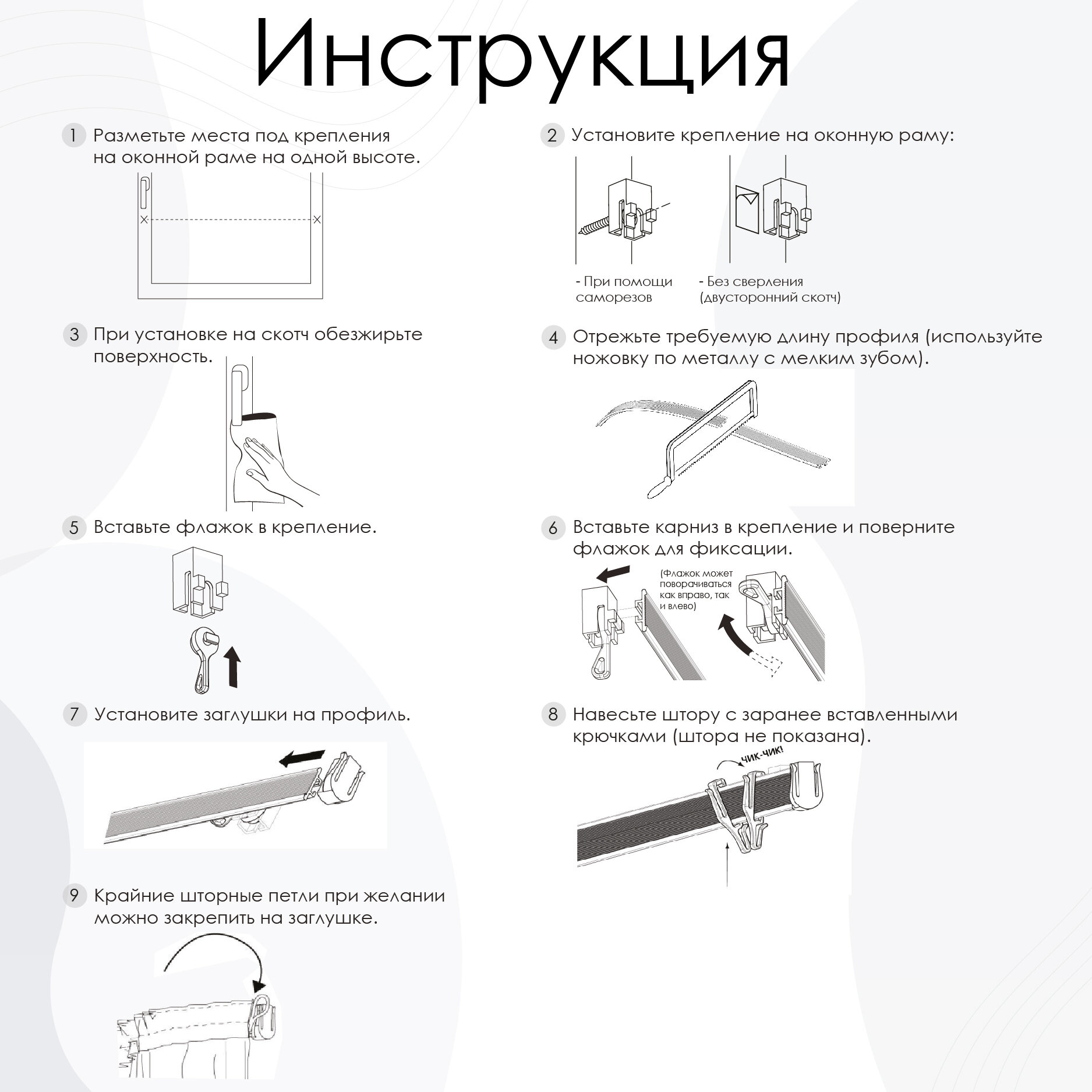 | Комплектация | Пластиковый профиль (ПВХ-композиция), крючки (POM), заглушки (ABS) , крепления (ABS), скотч (ППЭ), саморезы (металл) |