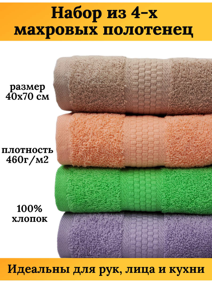 Полотенце махровое, 4 штуки, 40х70 см, 460 гр.м2, кухонные полотенца,100% хлопок, бежевый, салатовый, персиковый, сиреневый информация: