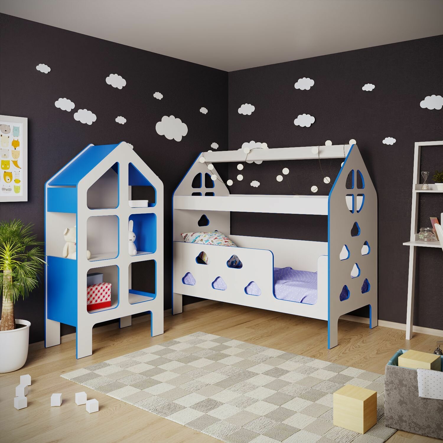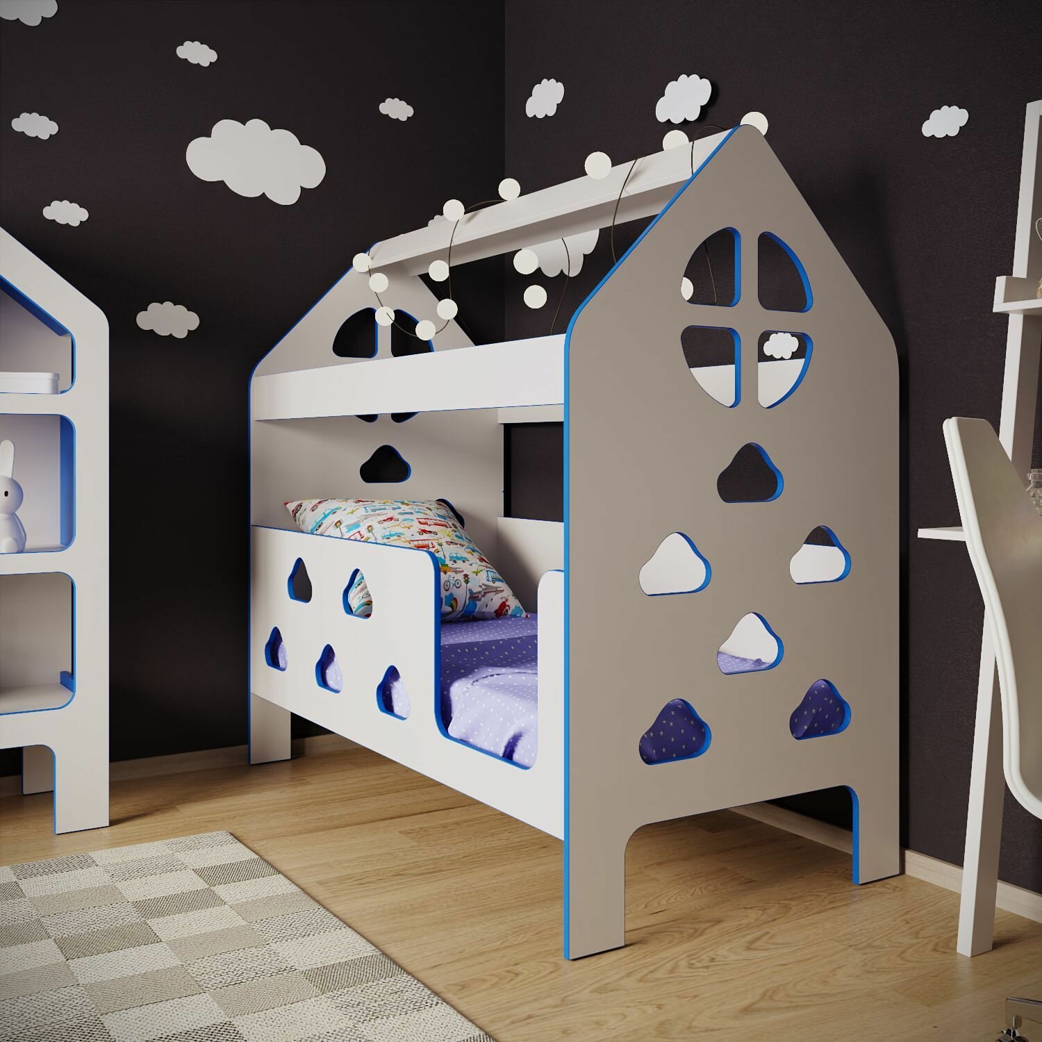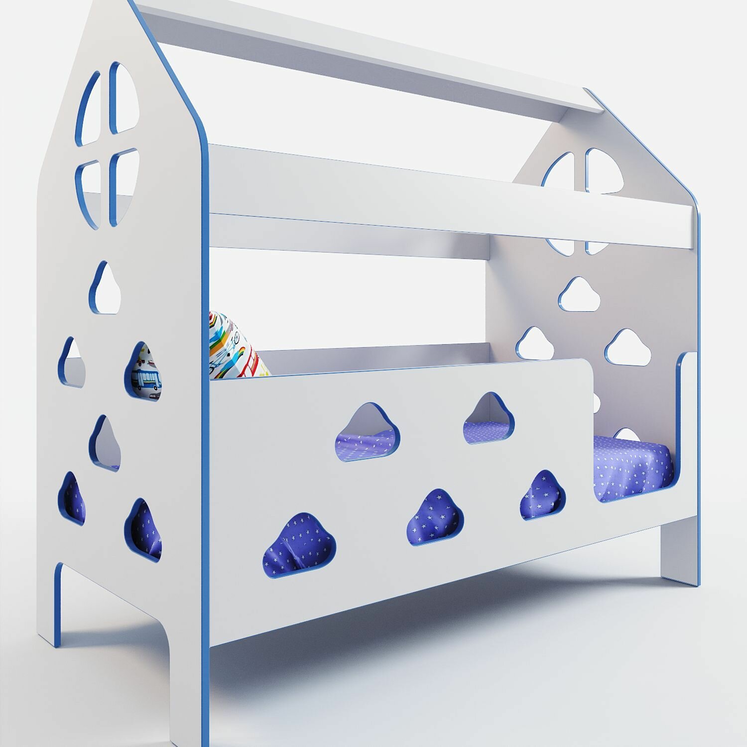 10 цен на Кровать детская с бортиком под матрас 160х80, кровать-домик "Облачка", БазисВуд, вход справа, цвет синий