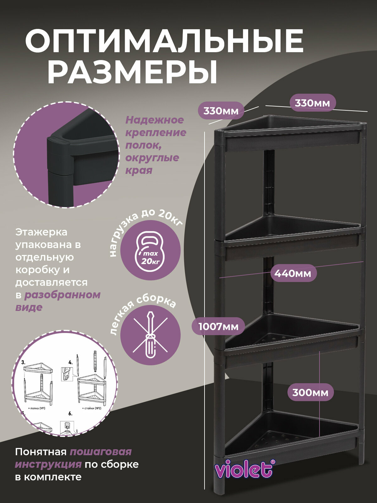 Этажерка для ванной 4х ярусная VIKEA угловая, цвет черный / стеллаж для хранения напольный для кухни информация: