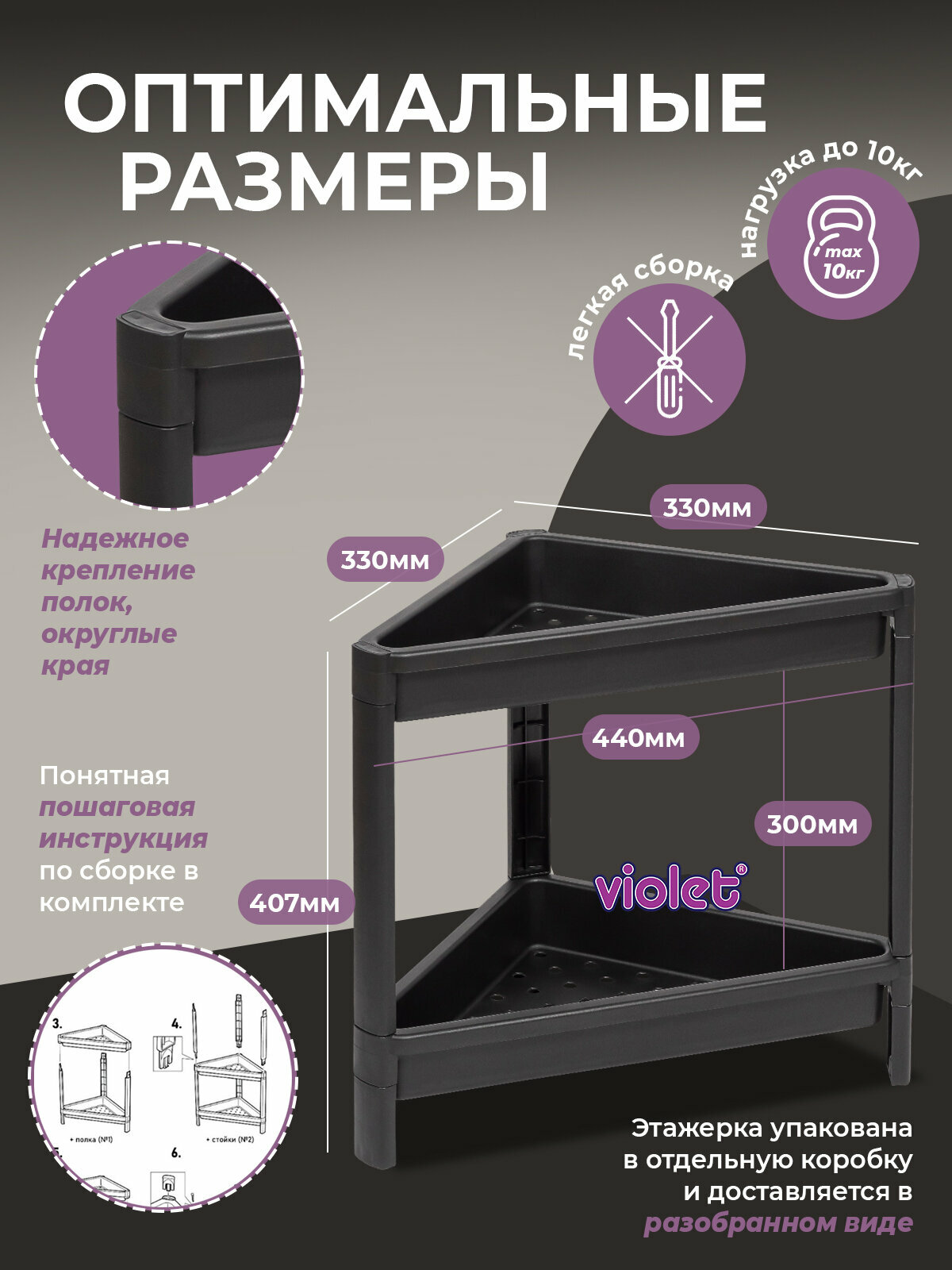 Этажерка для ванной 2х ярусная VIKEA угловая, цвет черный / Стеллаж напольный для кухни / Органайзер для хранения вещей универсальный пластиковый