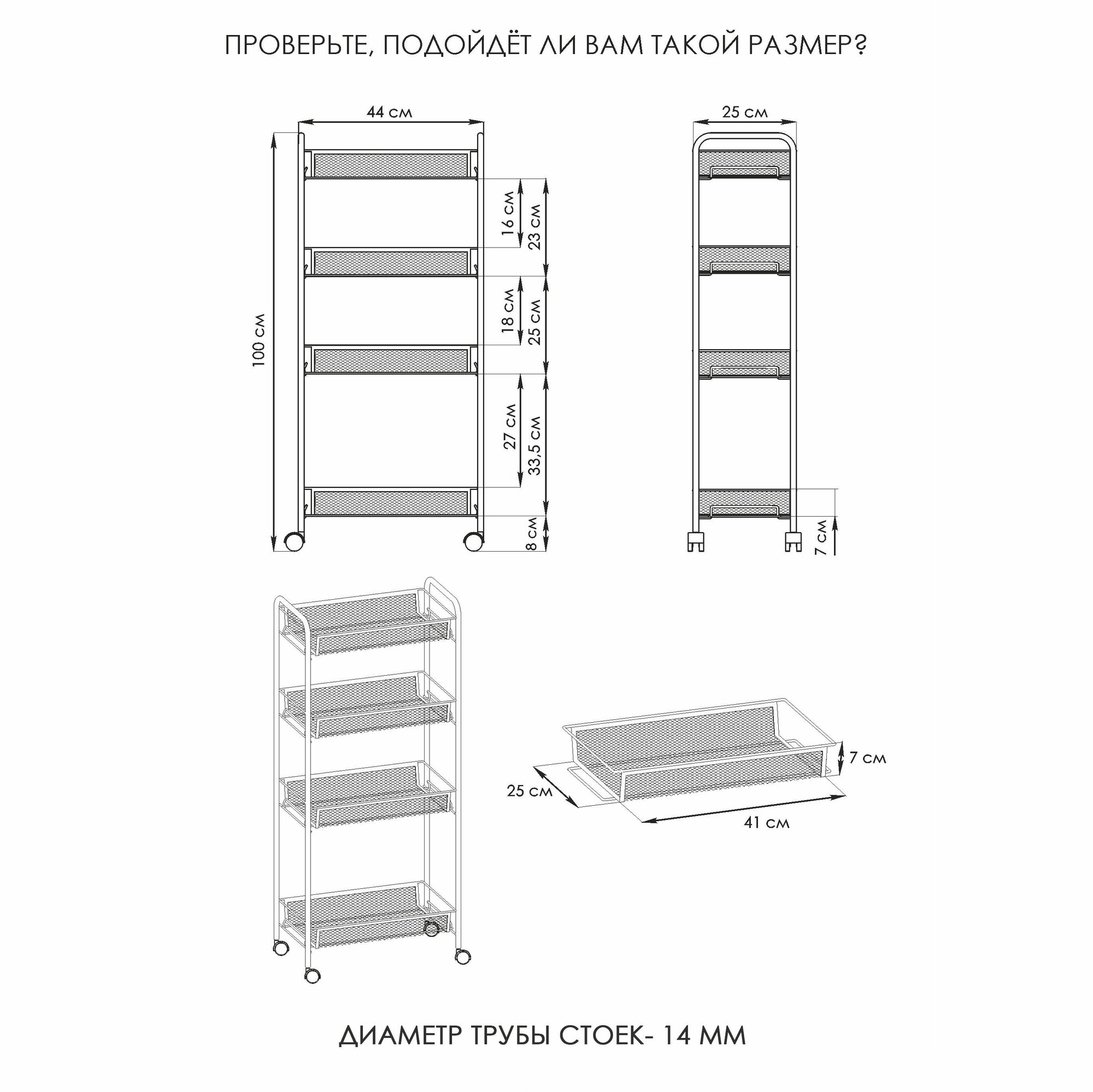 Этажерка Ладья на колесиках 24К (белый) 44*25*100см, 4корзины (до 10кг каждая) d=12мм Э342Б ЗМИ