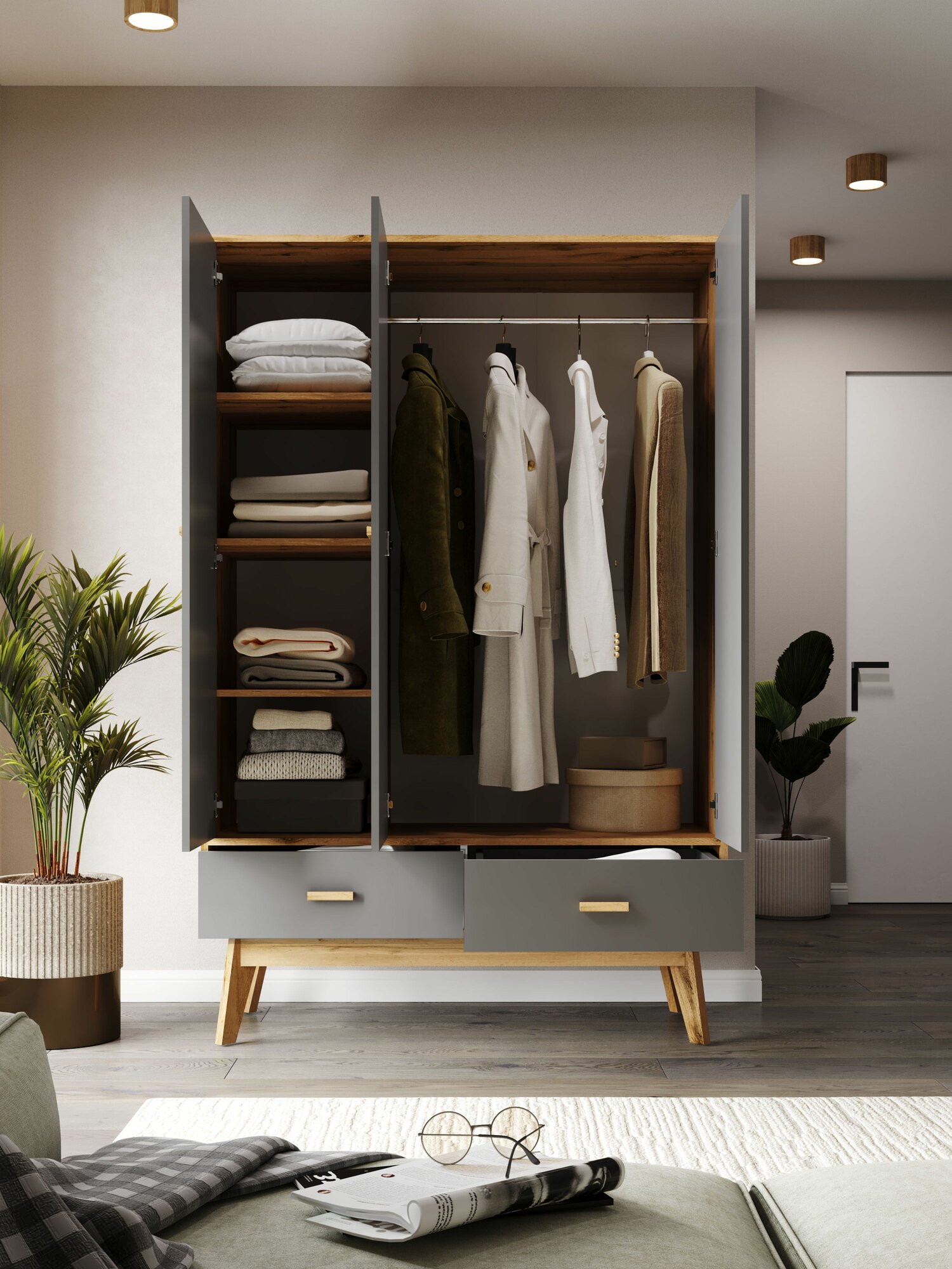 Отзывы на Шкаф для одежды 3-х дверный, Распашной шкаф для прихожей, Принцесса Мелания, Графит / Дуб вотан, 1850х1190х500 мм
