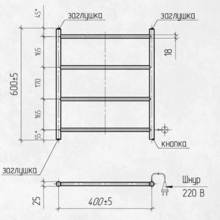Полотенцесушитель электрический ZEIN PE-04, "Классика", 400х600 мм, 4 перекладины, черный информация: