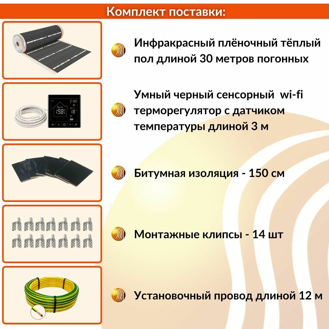 Пленочный электрический теплый пол, с умным черным wi-fi терморегулятором. Инфракрасная пленка 15 м2 информация: