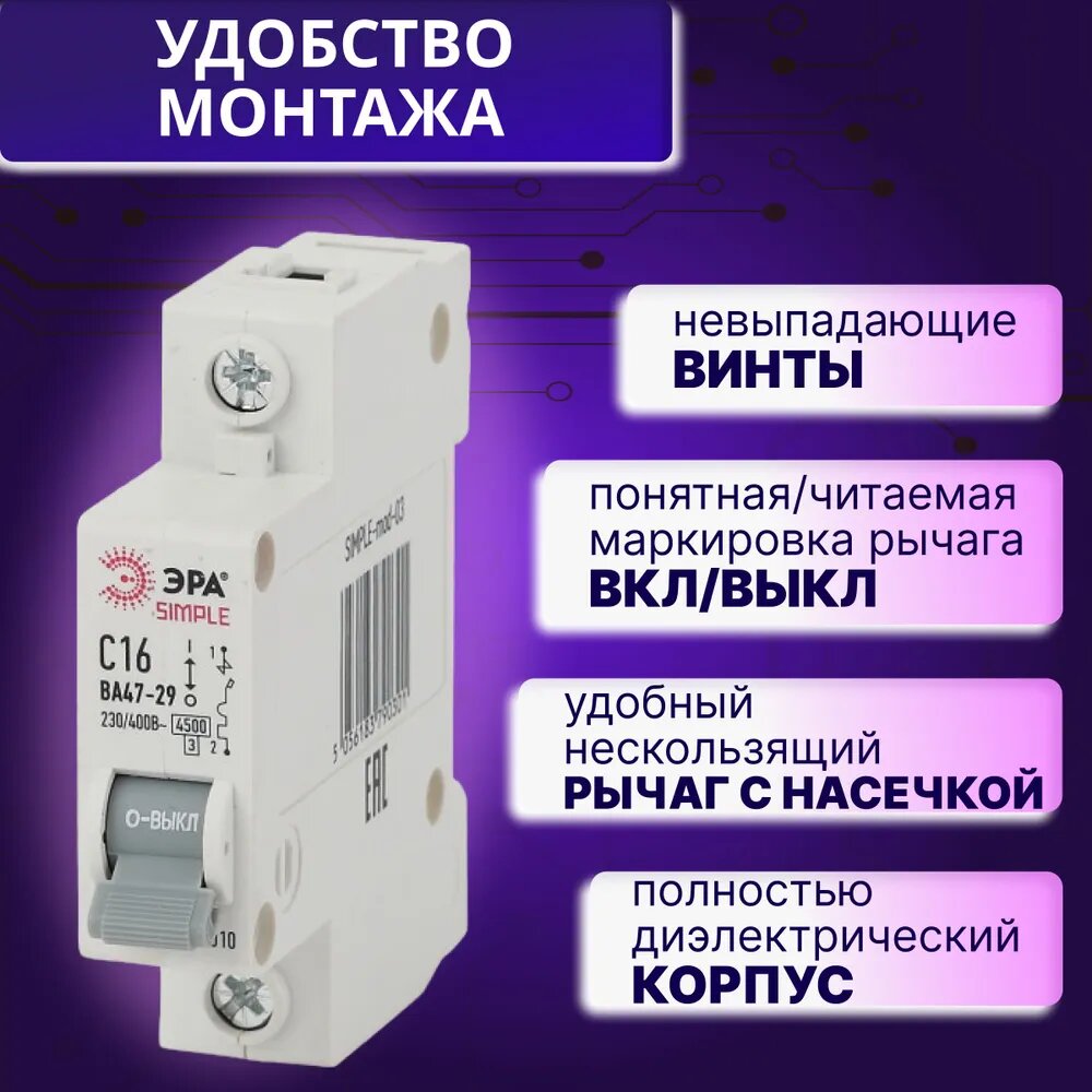 Автоматический выключатель 1P (1П) 16А (С) 4,5кА ВА 47-29 SIMPLE-mod-03 ЭРА Б0039220 10шт информация: