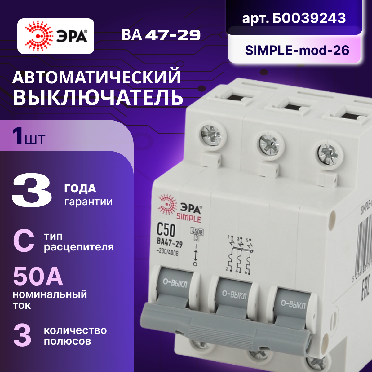 Автомат Б0039243 ЭРА SIMPLE-mod-26 3P 50А (C) 4,5кА выключатель ВА 47-29