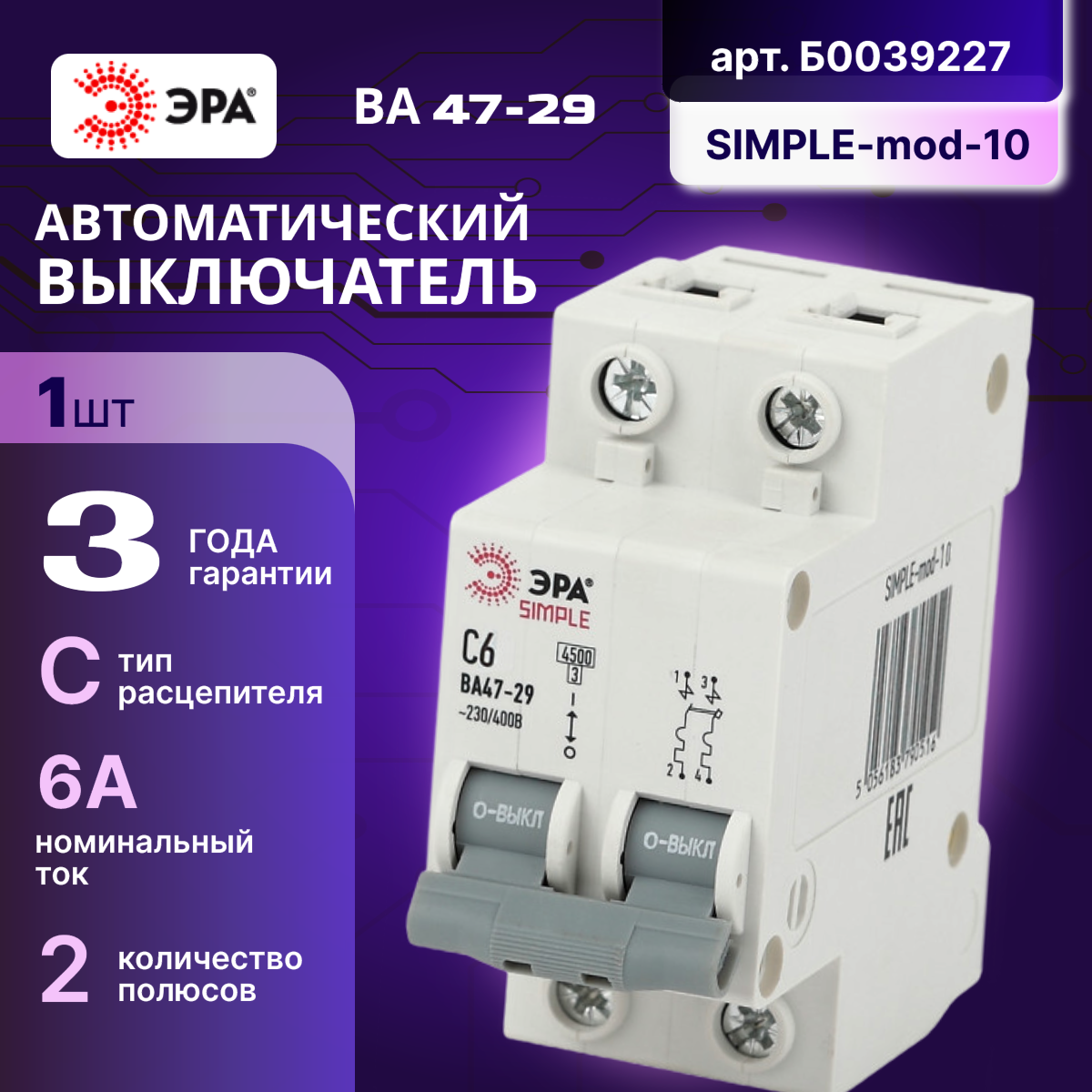 10 цен на Автоматический выключатель 2P (2П) 6А (C) 4,5кА ВА 47-29 SIMPLE-mod-10 ЭРА Б0039227