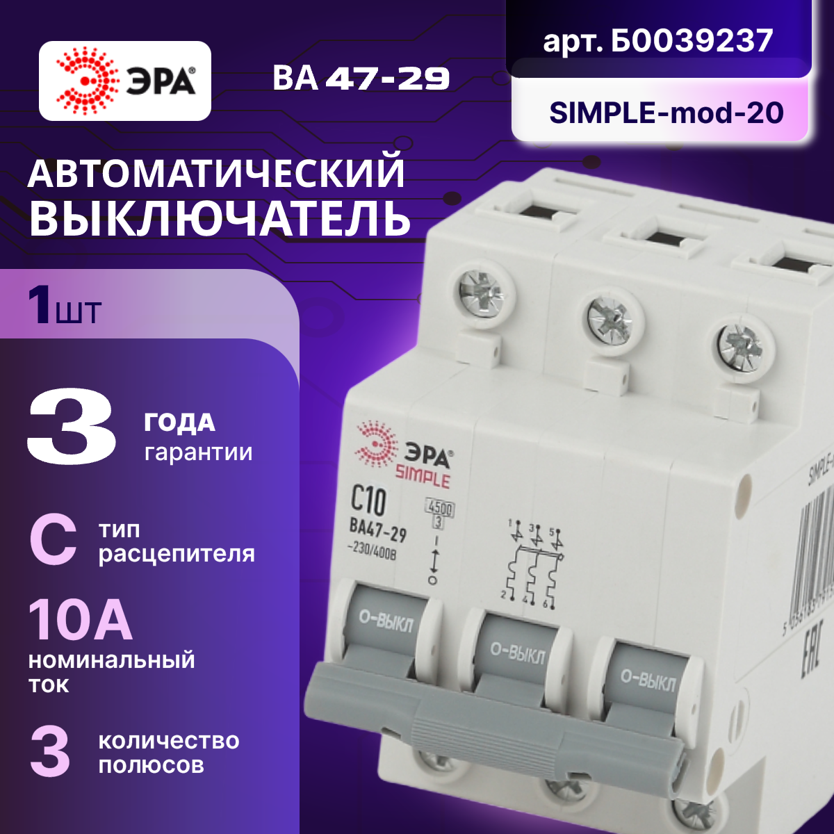 Автоматический выключатель ЭРА Simple-mod-20 3P 10А (C) 4,5кА ВА 47-29 арт. Б0039237 (1 шт.)