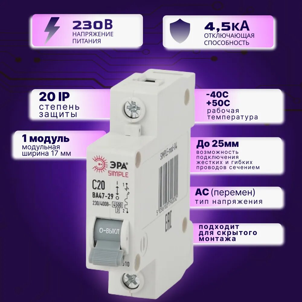 Автоматический выключатель 1P (1П) 20А (C) 4,5кА ВА 47-29 SIMPLE-mod-04 ЭРА Б0039221 5шт информация: