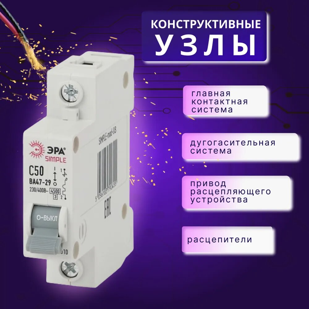 Отзывы на Автоматический выключатель 1P (1П) 50А (C) 4,5кА ВА 47-29 SIMPLE-mod-08 ЭРА Б0039225 4ШТ