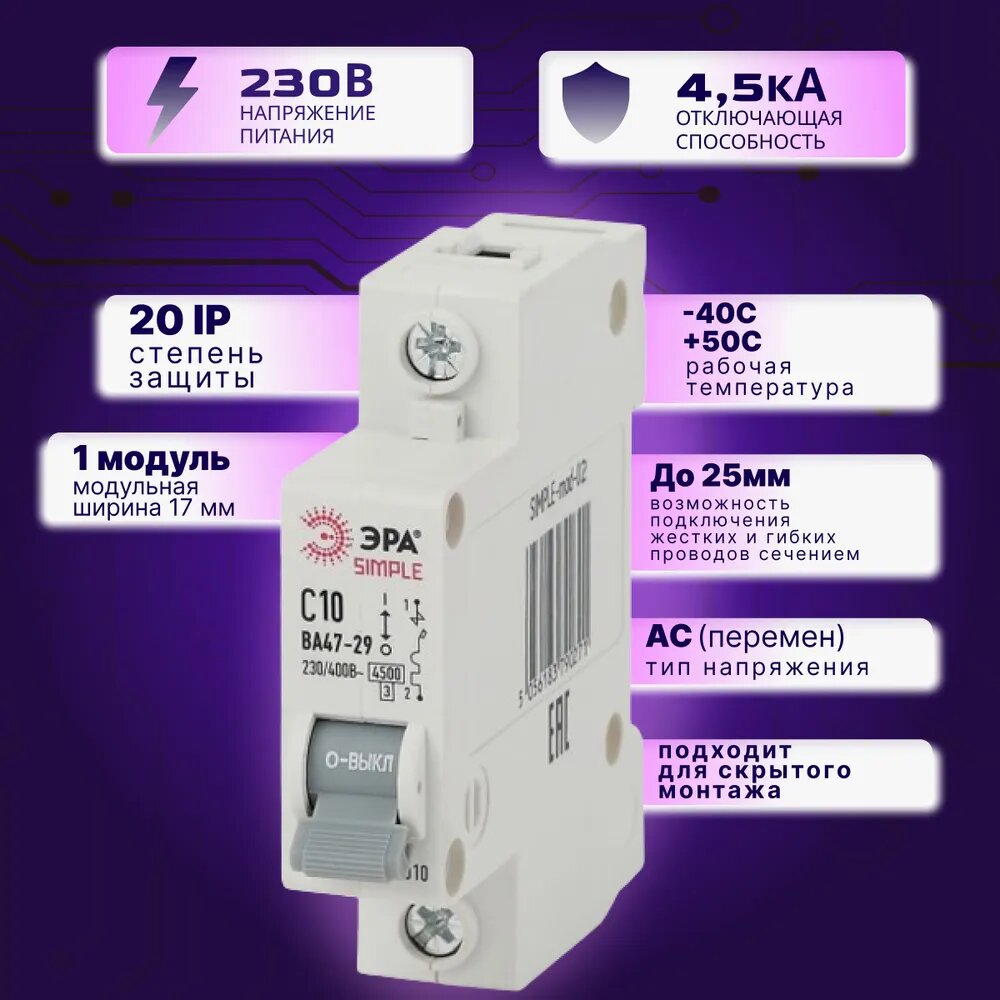 Автоматический выключатель 1P (1П) 10А (С) 4,5кА ВА 47-29 SIMPLE-mod-02 ЭРА Б0039219 5шт информация: