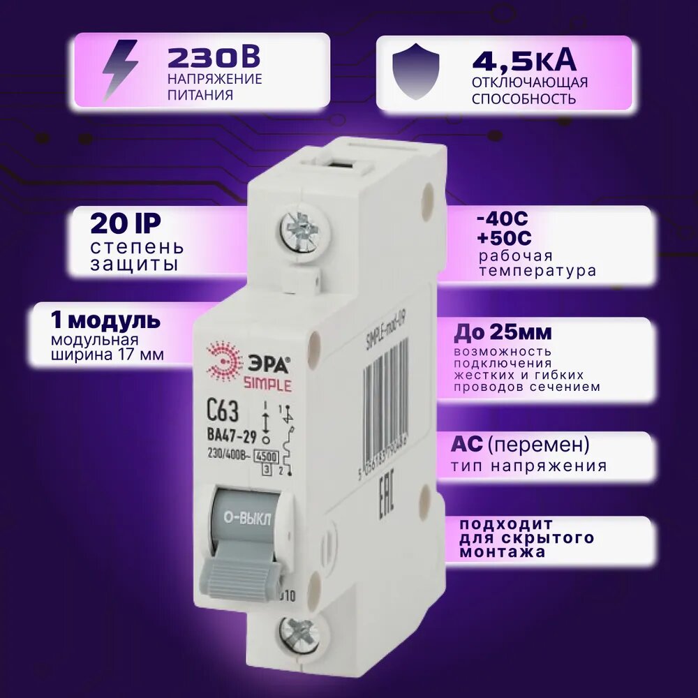 10 цен на Автоматический выключатель 1P (1П) 63А (C) 4,5кА ВА 47-29 SIMPLE-mod-09 ЭРА Б0039226 12шт