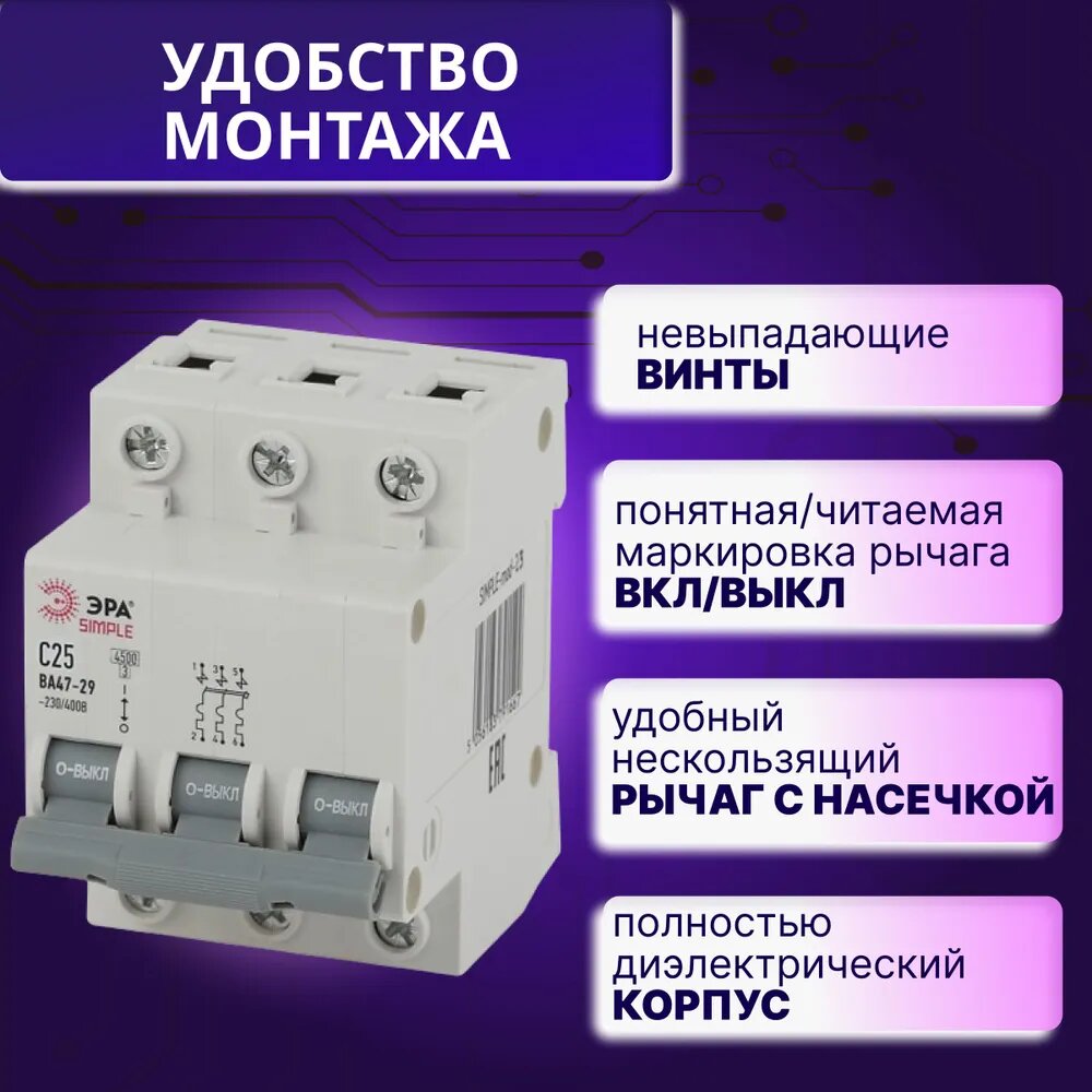 Отзывы на Автоматический выключатель 3P (3П) 25А (C) 4,5кА ВА47-29 SIMPLE-mod-23 ЭРА Б0039240 3шт