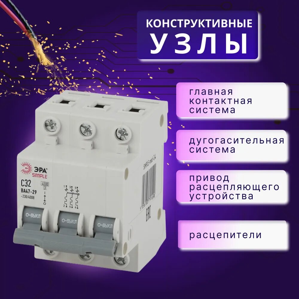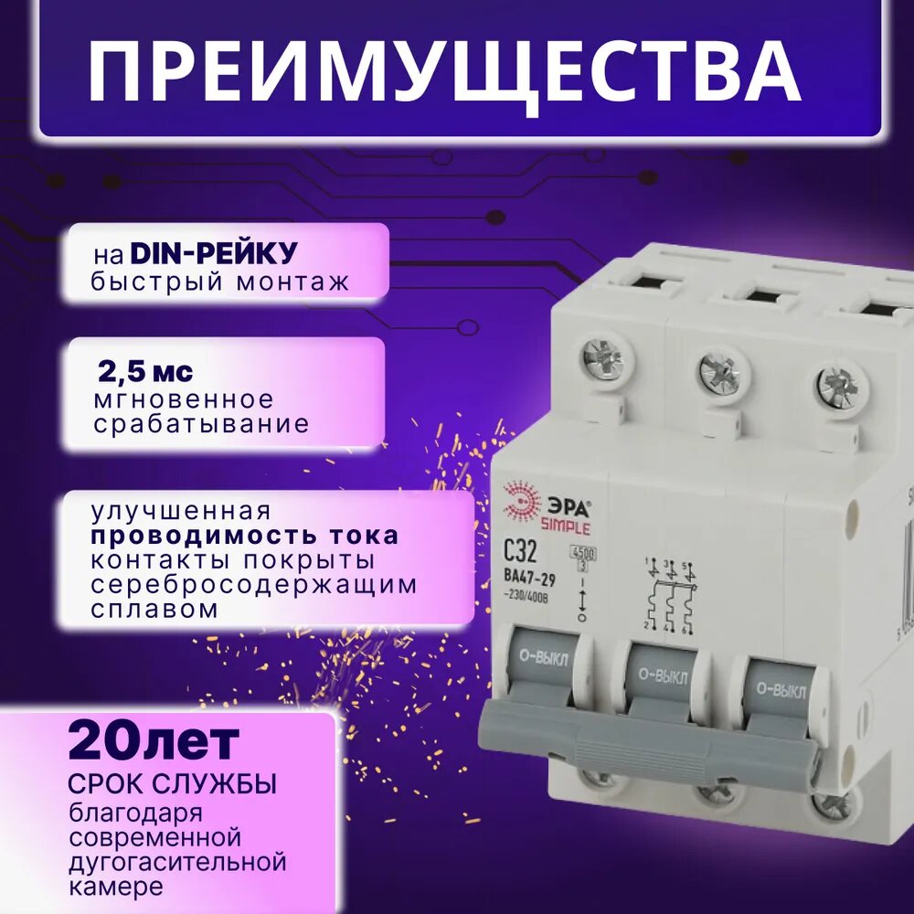 Автоматический выключатель 3P (3П) 32А (C) 4,5кА ВА47-29 SIMPLE-mod-24 ЭРА Б0039241 4шт информация: