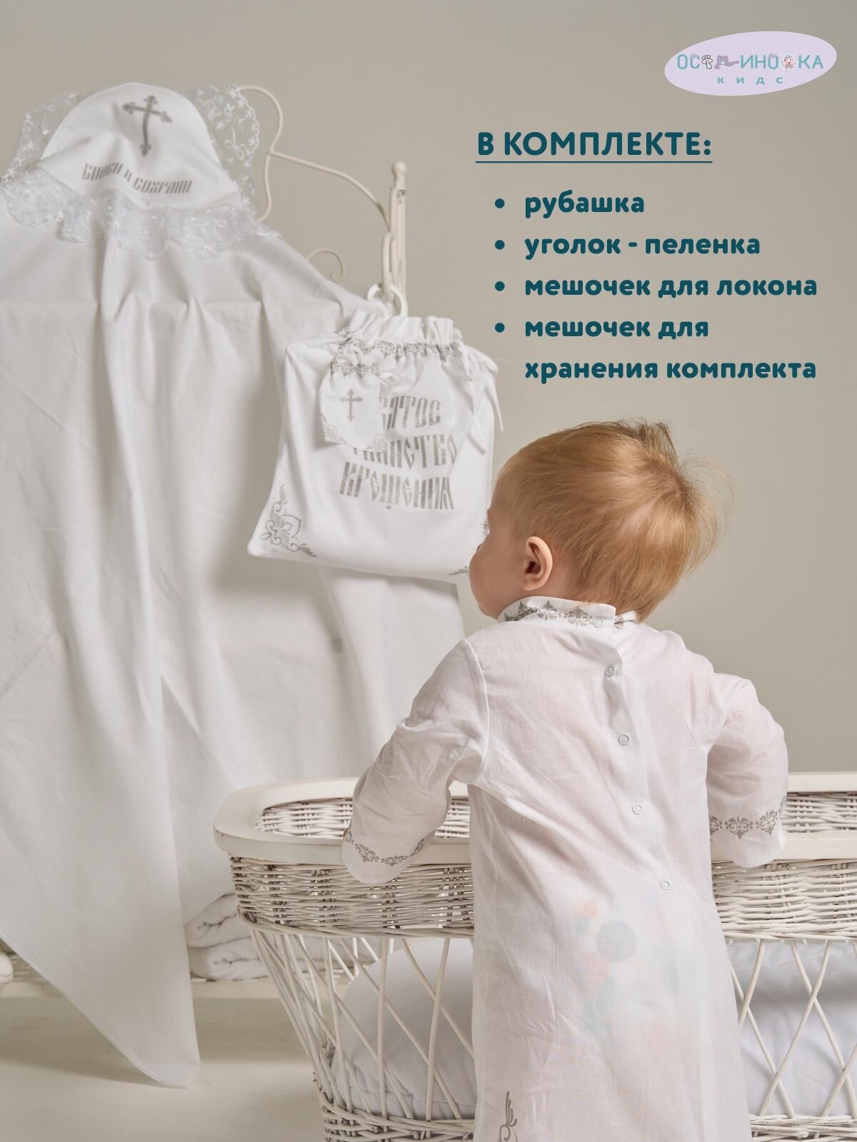 10 цен на Крестильный набор (комплект) для мальчика: крестильная рубашка, уголок (крыжма) для крещения, мешочки 68 серебро