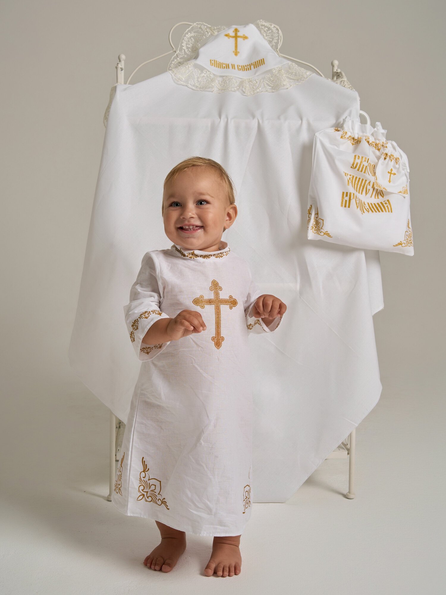 3213 Крестильный комплект для мальчика 4-х предметный:рубашка, уголок, мешочек, мешочек для волос, золотой