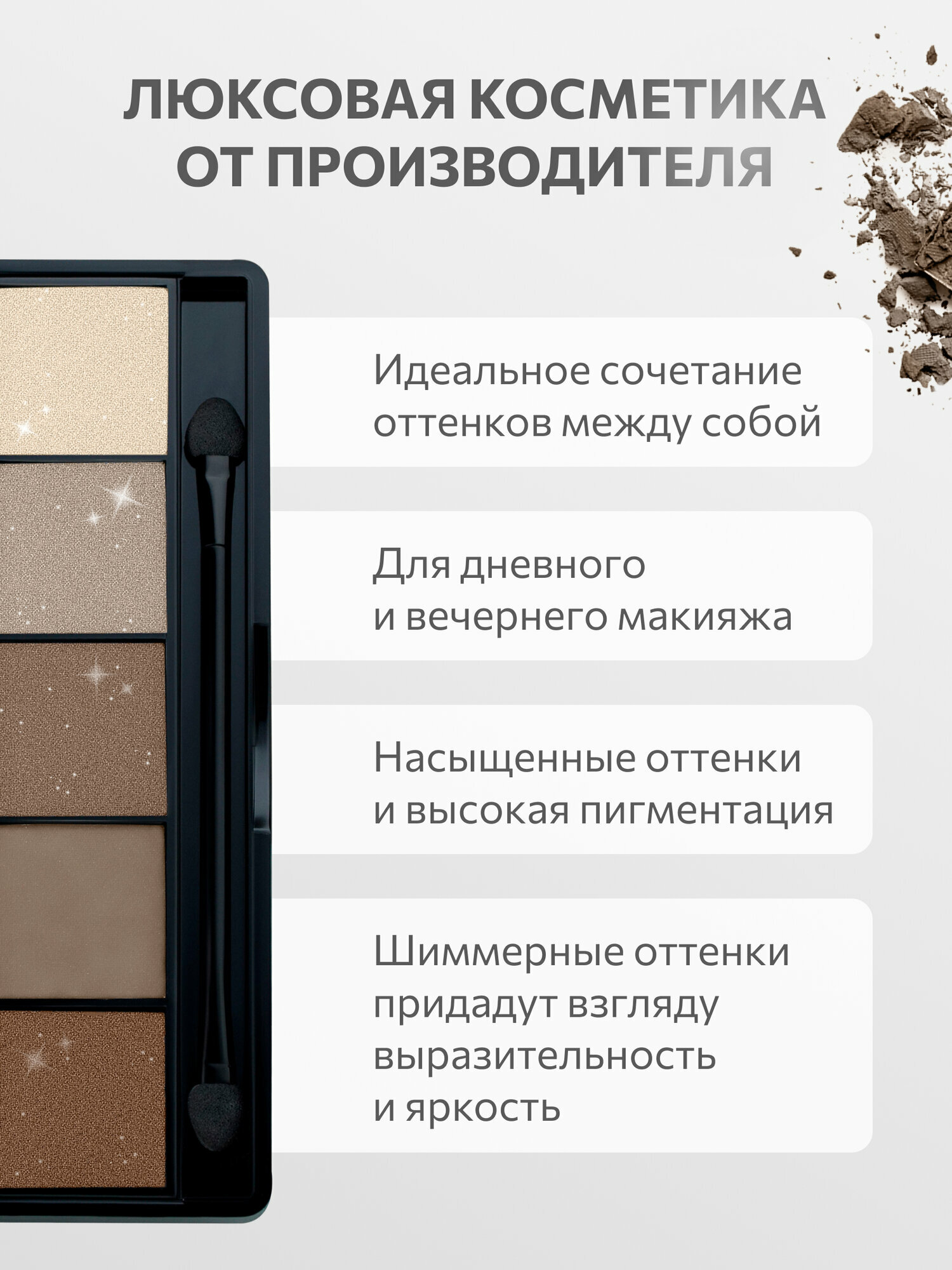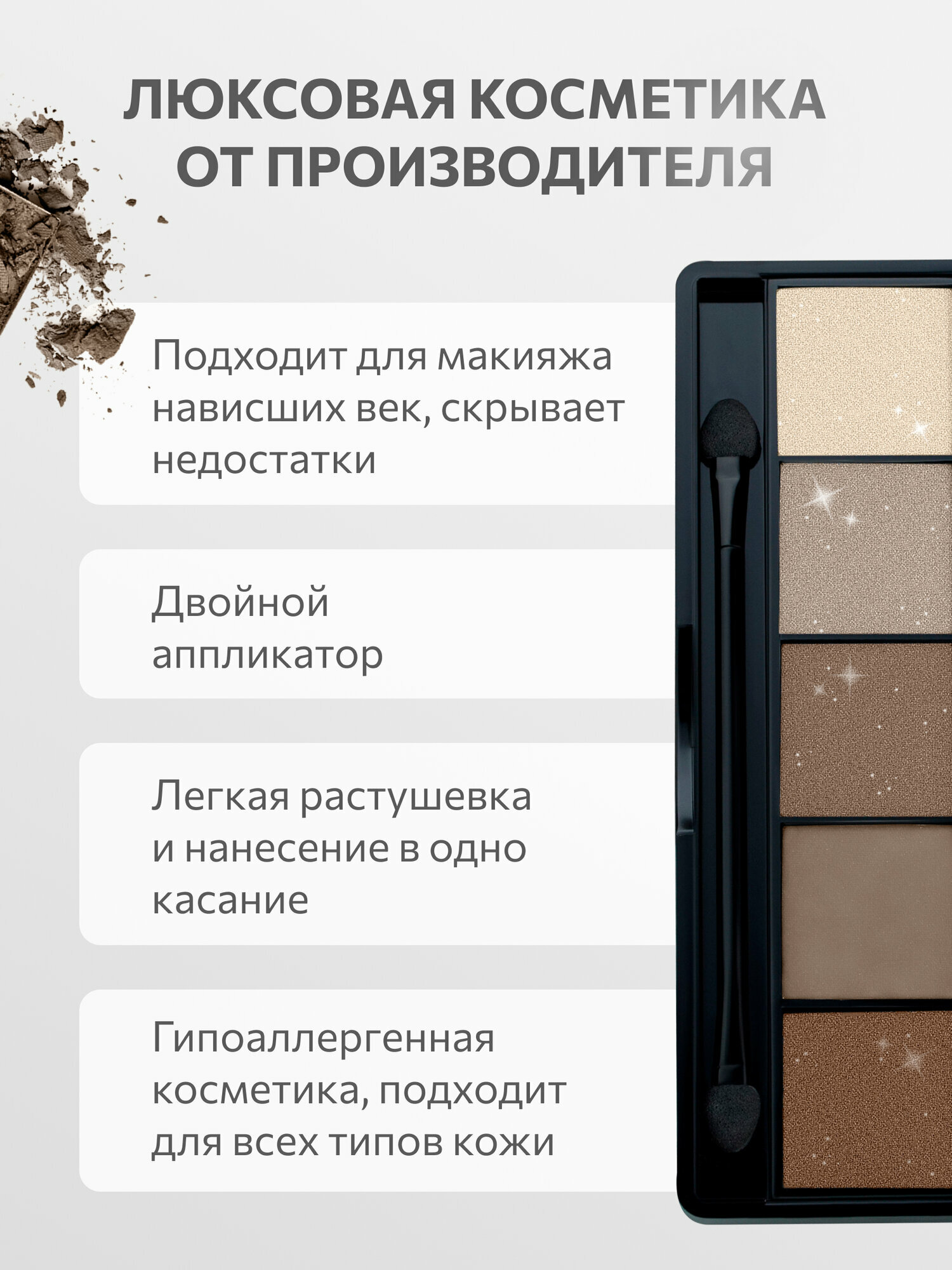 | Особенности | аппликатор в комплекте / гипоаллергенные / запеченные / минеральные / не тестируются на животных / протестированы дерматологически |