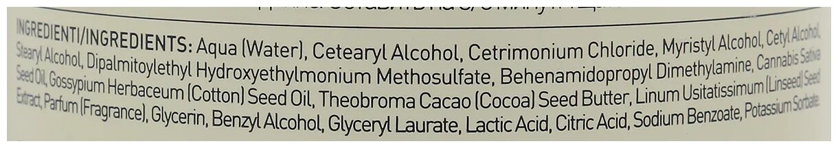 | Состав | aqua (water), cetrimonium chloride, cetearyl alcohol, myristyl alcohol, cannabis sativa seed oil, gossipyum herbaceum (cotton) seed oil, theobroma cacao (cocoa) seed butter, linum usitatissimum (linseed) seed extract, parfum (fragrance), citric acid, magnesium nitrate, magnesium chloride, methylchloroisothiazolinone, methylisothiazolinone |