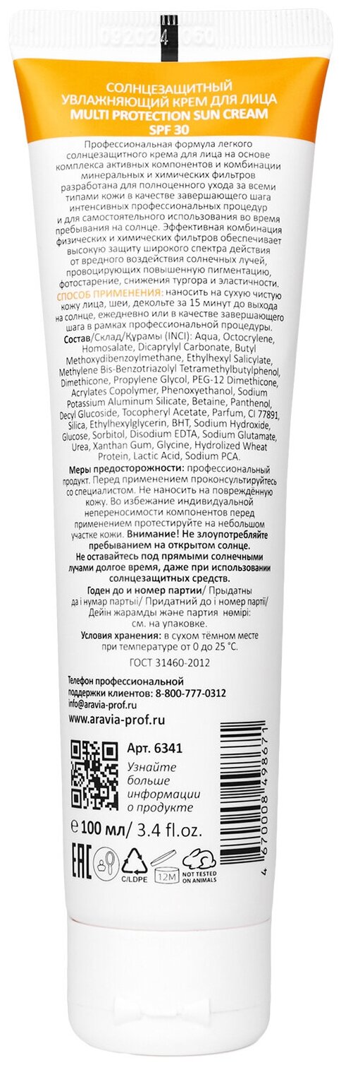 ARAVIA Professional Солнцезащитный увлажняющий крем для лица Multi Protection Sun Cream SPF 30, 100 мл информация: