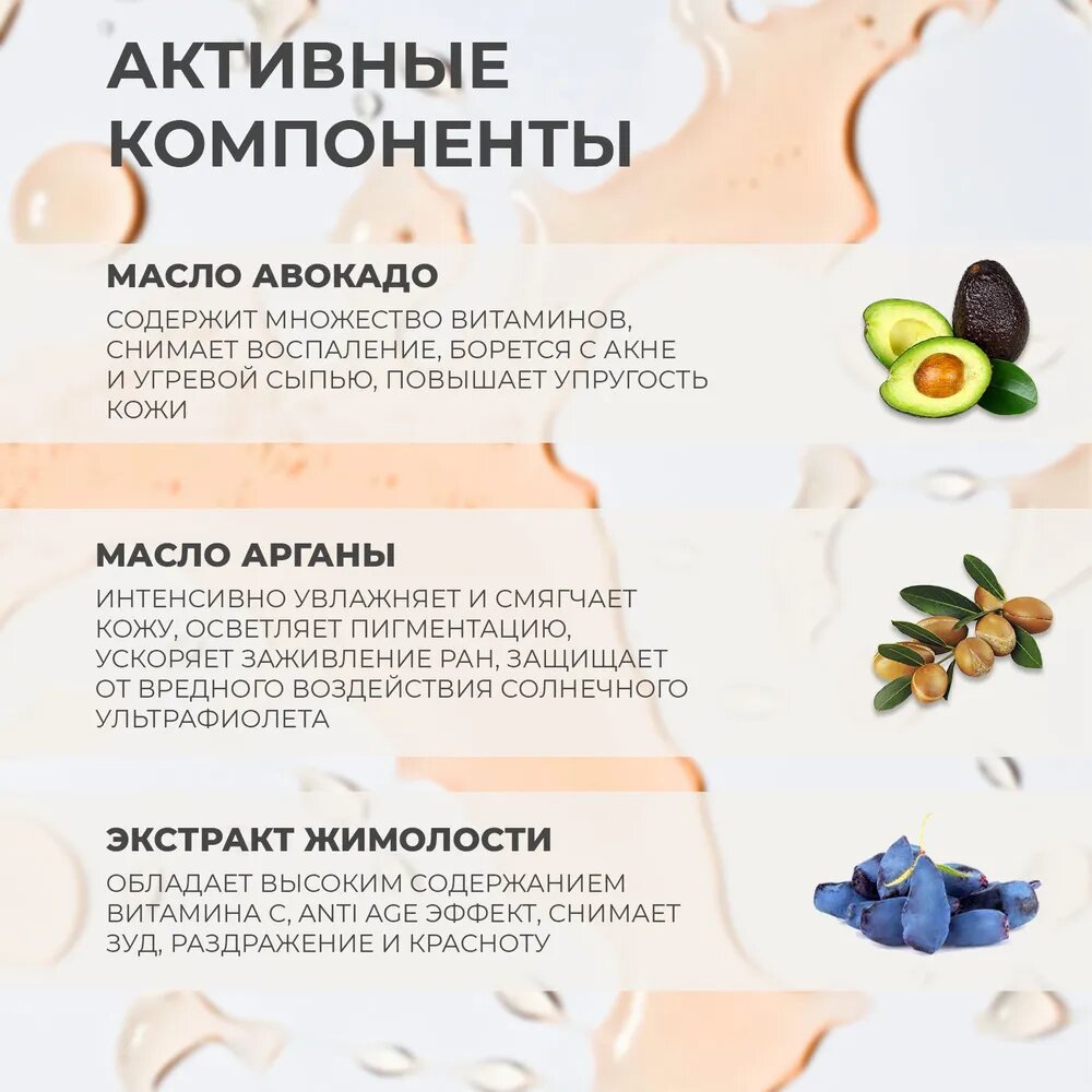 | Масла и экстракты | аргановое масло / кокосовое масло / масло авокадо / масло камелии / масло подсолнечника / оливковое масло / экстракт алоэ / экстракт жасмина / экстракт зеленого чая |