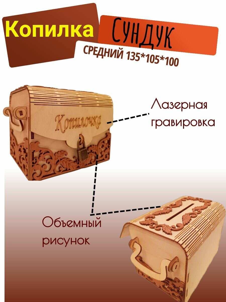 10 цен на Копилка для денег "Копилочка" в форме сундучка 135 х 105 х 100 мм из дерева, с вензелями