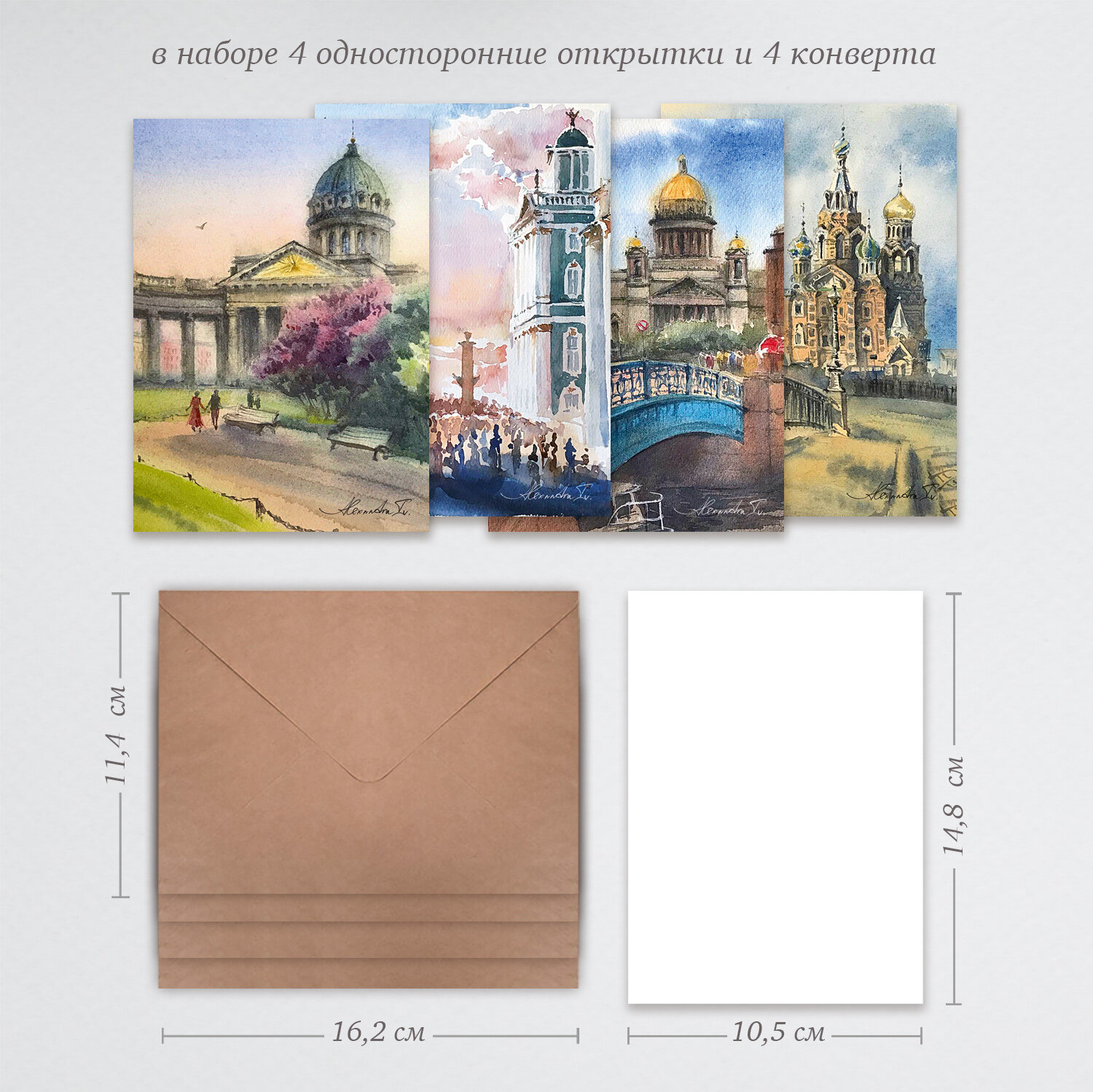 | Подробная комплектация | 4 открытки и 4 крафт конверта |