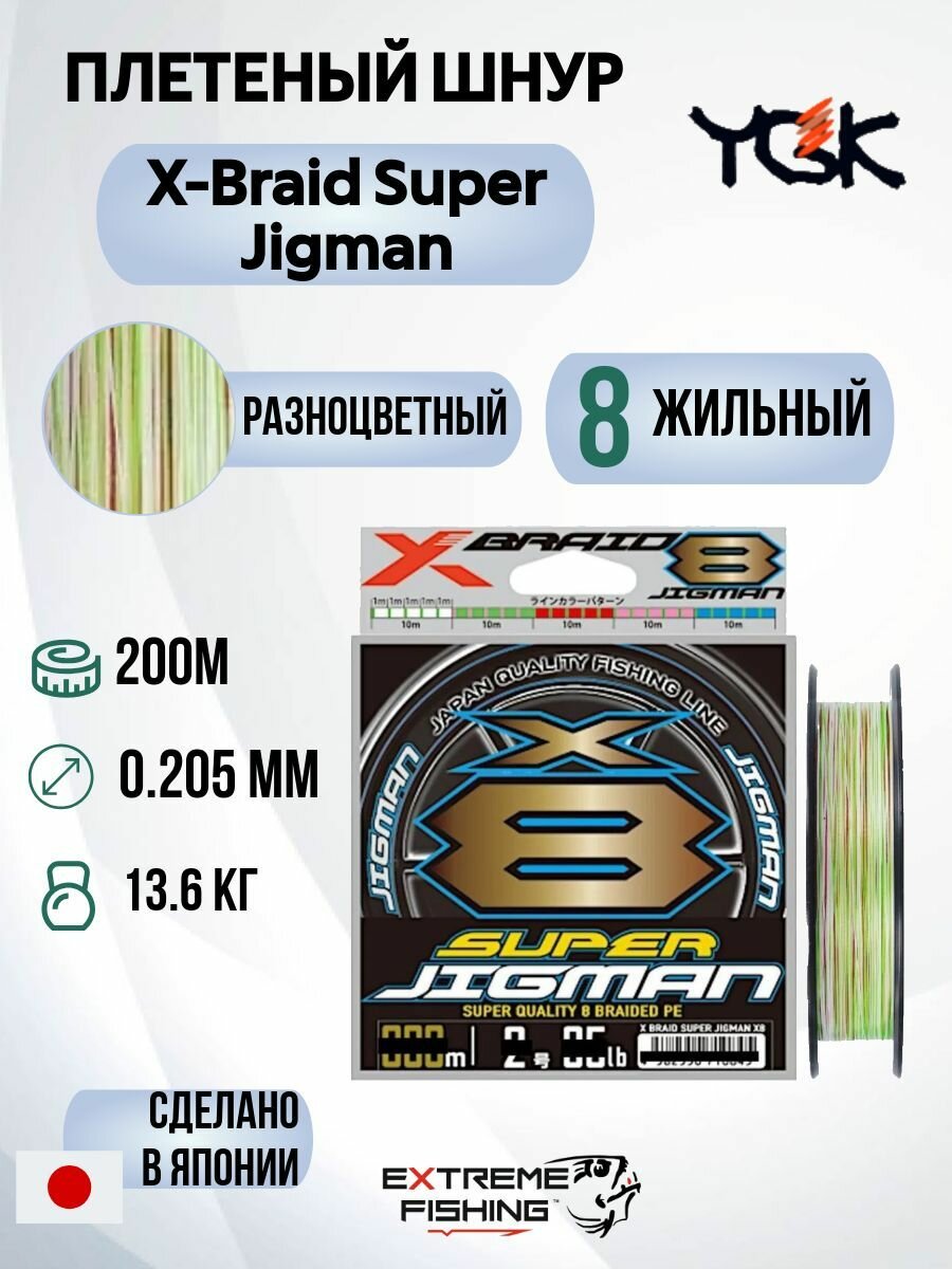 Шнур YGK X-Braid Super Jigman X8 200м Multicolor #2.0, 0.235мм, 35lb, 15.8кг 4 977 ₽