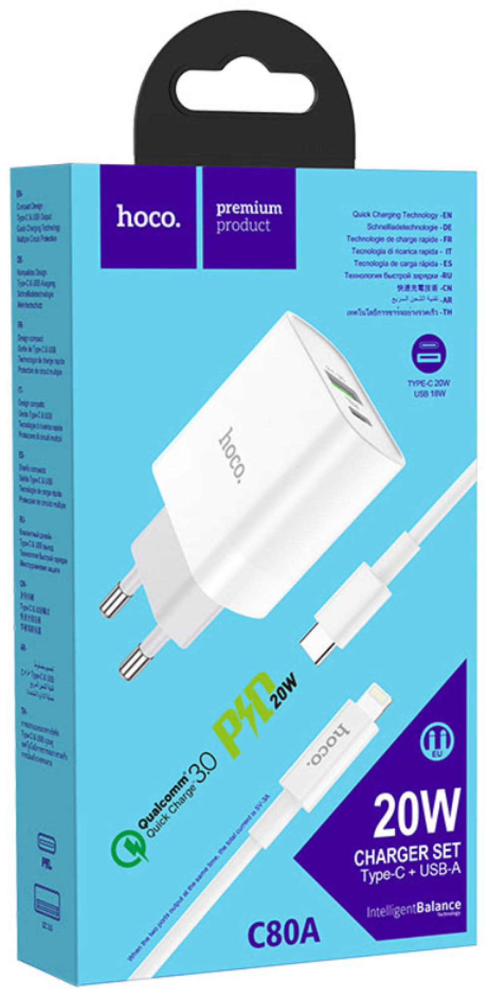 Сетевое зарядное устройство, 1 USB 3.0 QC+1 PD 20W (C80A), HOCO, Type-C to Lightning, белый информация: