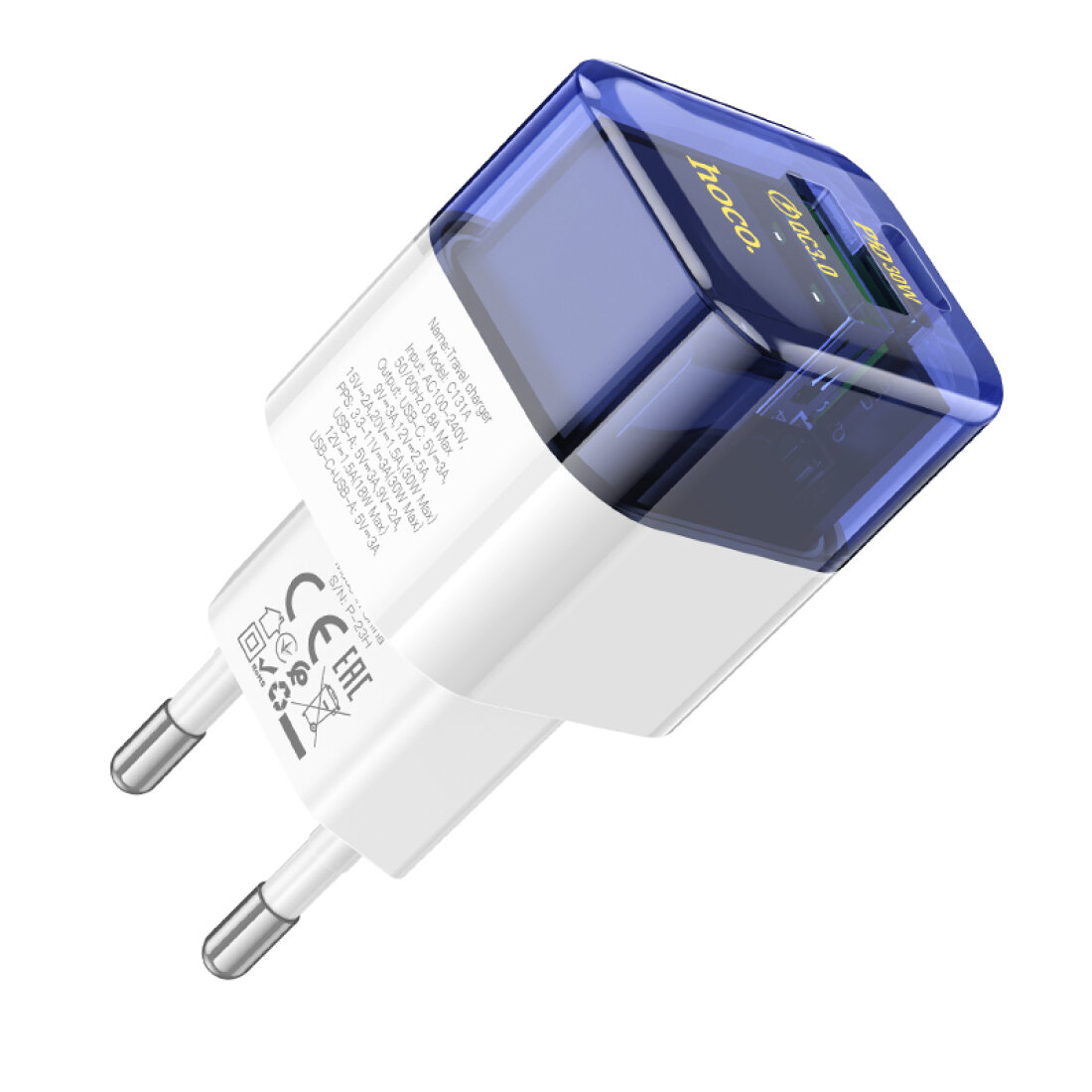 Сетевое зарядное устройство, 1 USB 3.0 QC+1 PD 30W (C131A), HOCO, прозрачный с синим информация:
