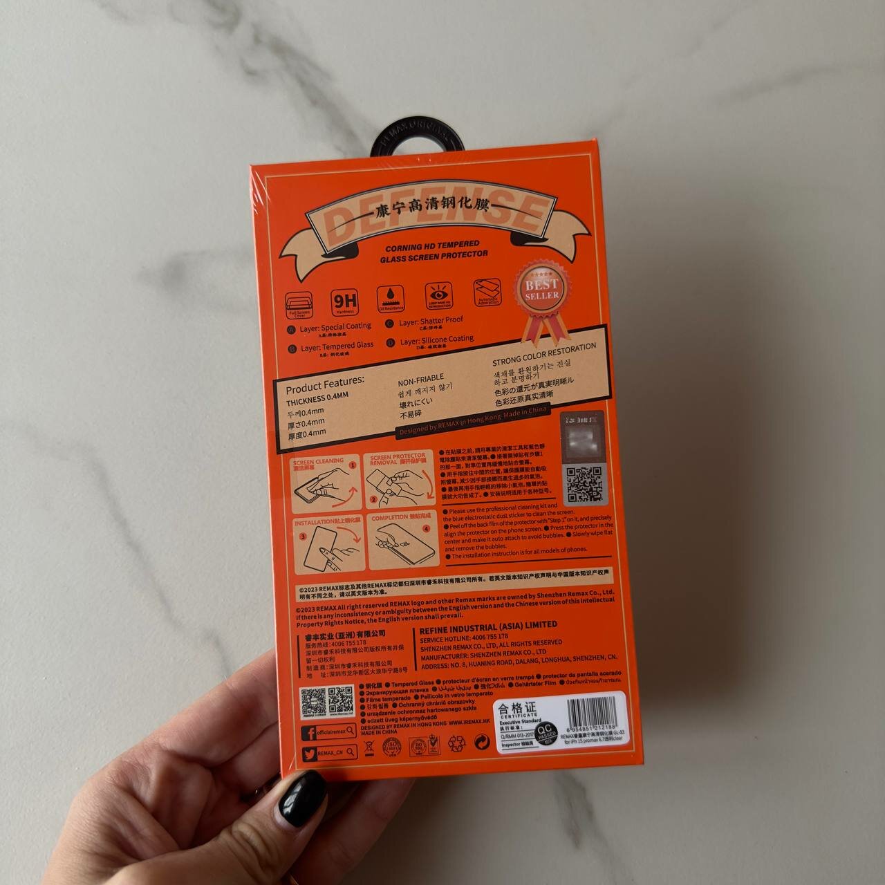 | Подробная комплектация | Надежная упаковка; супер прочное защитное стекло Remax; влажная салфетка; тряпочка из микрофибры; стикеры для удаления пыли |