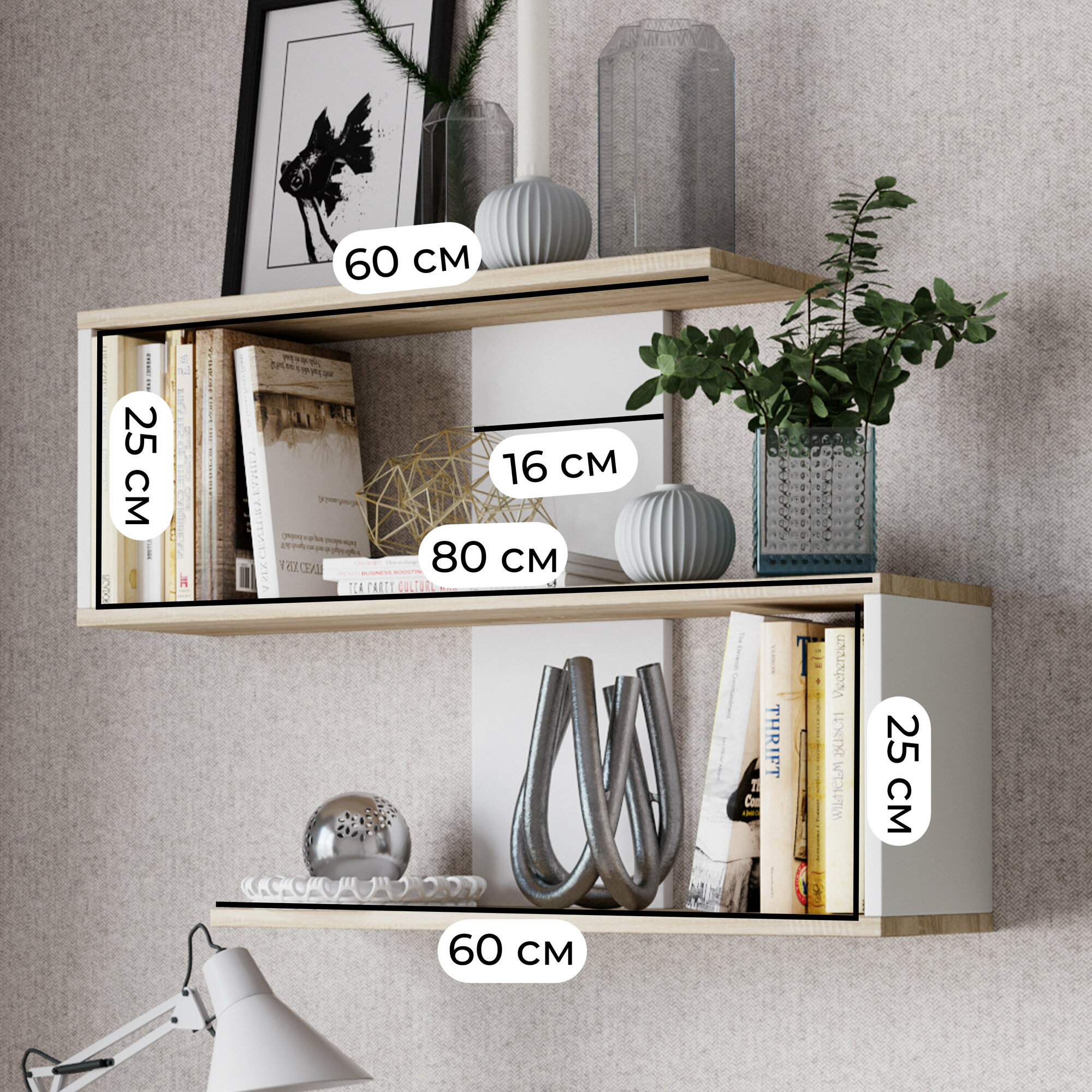 Настенная полка ТриЯ Diamond тип 1, ЛДСП, дуб сонома, белая, 55x80x18 см 2 099 ₽