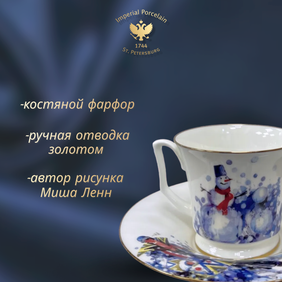 Чашка чайная с блюдцем, 210 мл. Императорский фарфоровый завод ИФЗ. Форма "Юлия", рисунок "Зима". Костяной фарфор. информация: