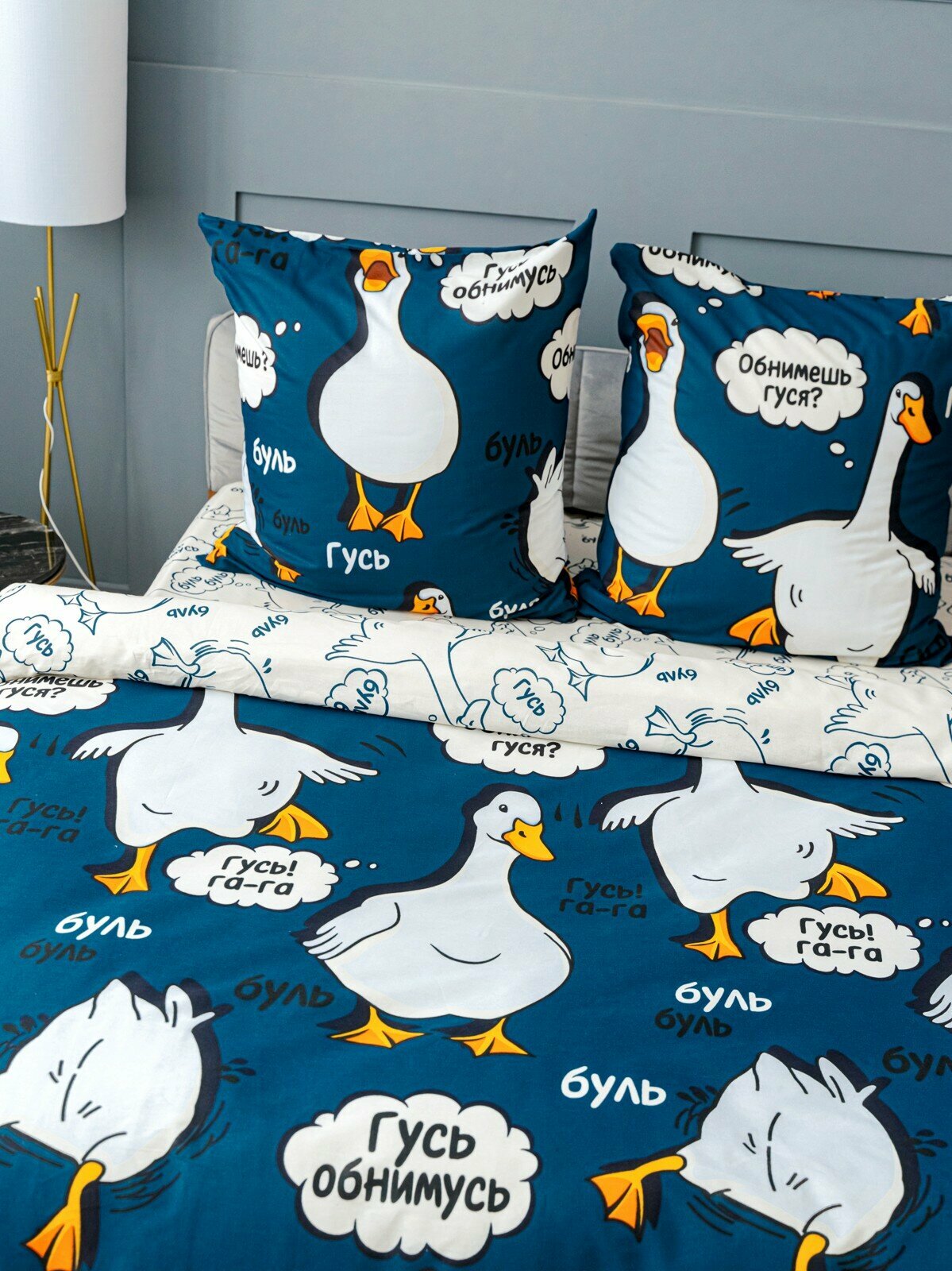 Постельное белье евро макси Павлинка "Гусь-обнимусь" синий, бязь 100% хлопок информация: