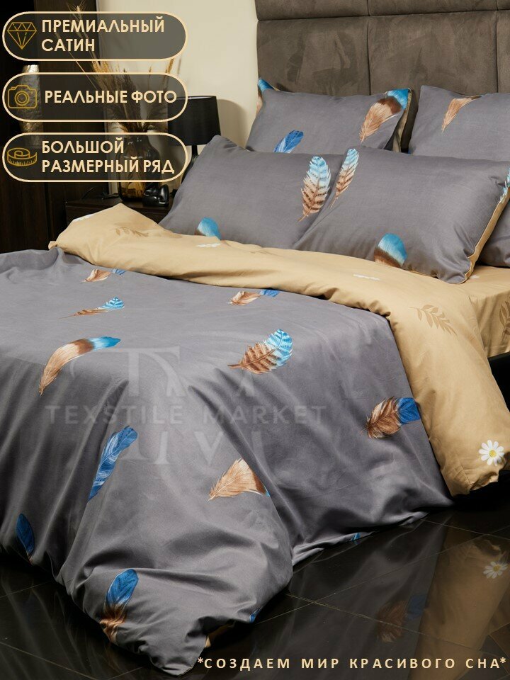 Комплект постельного белья Сатин-люкс 1,5-спальный, пододеяльник (на молнии) 150х215 см.-1шт. Простыня (на резинке по кругу) 90х200(+25) см.-1шт. Наволочки (без ушек) 70х70 см.-2шт. серый, бежевый 3 450 ₽