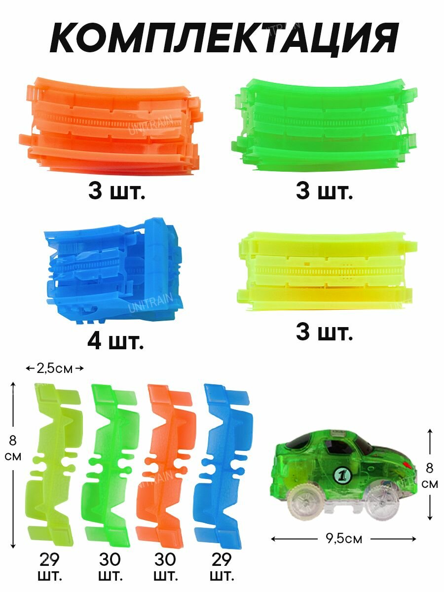 | Комплектация | машинка 1 шт., звенья гибкого полотна 118 шт., дуги мертвых петель 12 шт., заезды на мертвые петли 4 шт. |