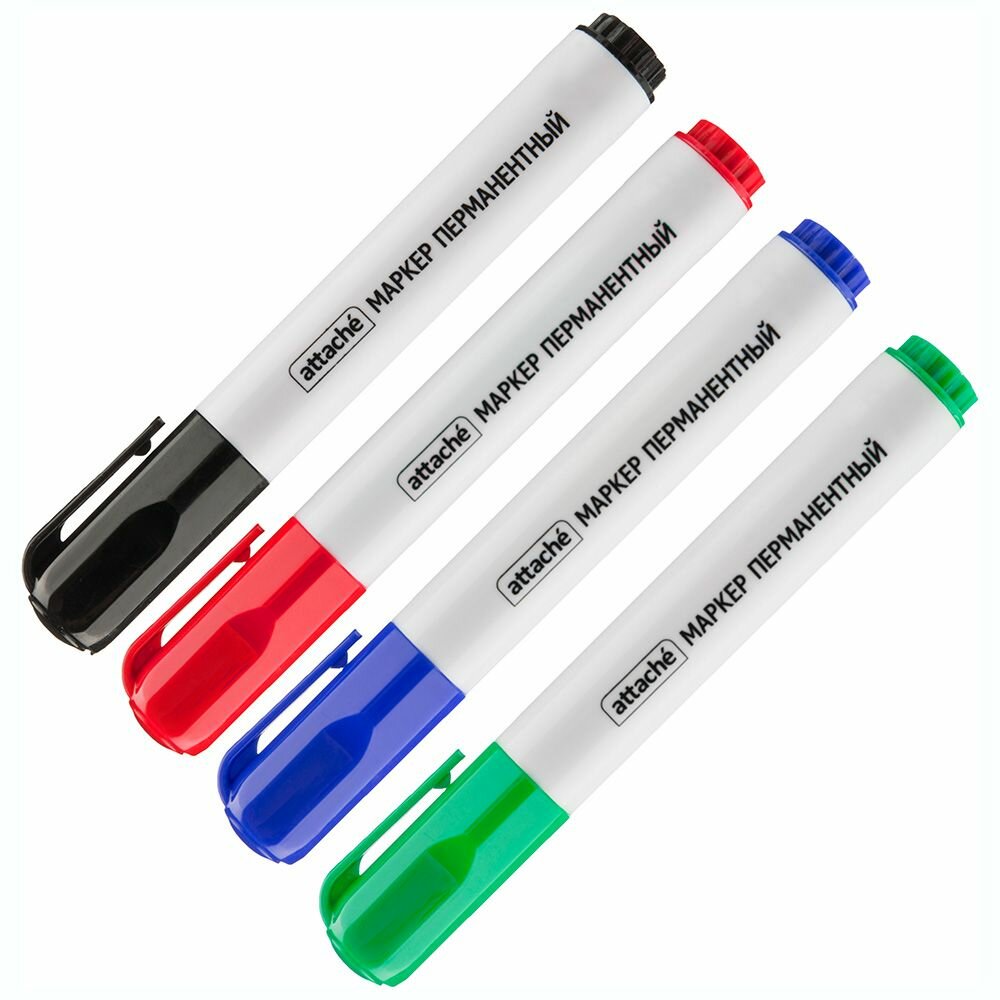 10 цен на Перманентный маркер Attache, нестираемый, для рисования и письма 1.5-3 мм, скошенный наконечник, 4 цвета в наборе