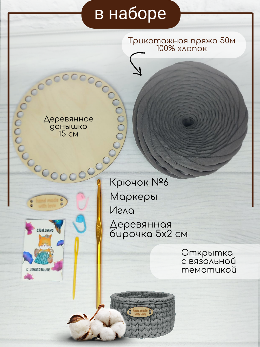 | Подробная комплектация | трикотажная пряжа изнаночной нарезки 50 метров, деревянное донышко 15 см, деревянная бирочка с надписью hand , металлический крючок №6, игла для сшивания изделий, маркировщики петель 2 шт, инструкция |