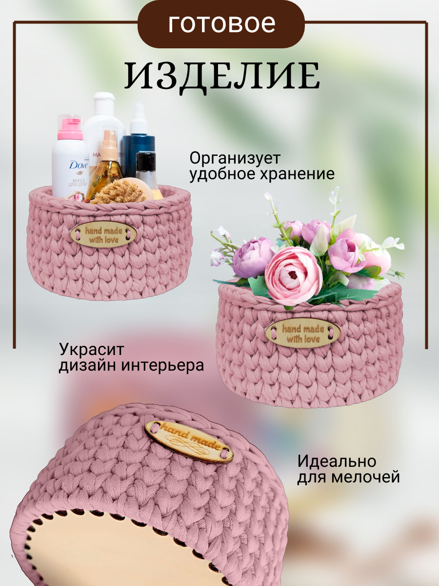 | Подробная комплектация | трикотажная пряжа изнаночной нарезки 50 метров, деревянное донышко 15 см, деревянная бирочка с надписью hand , металлический крючок №6, игла для сшивания изделий, маркировщики петель 2 шт, инструкция |