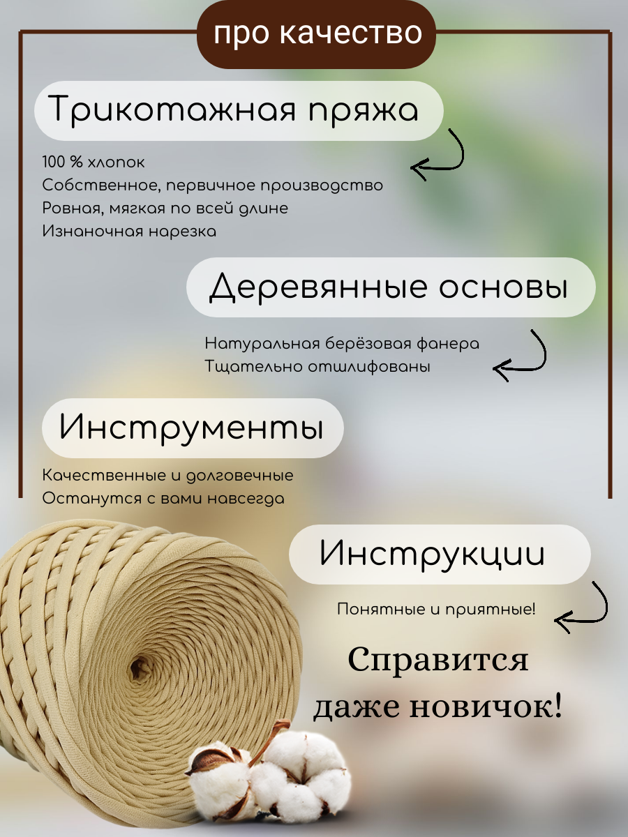 | Подробная комплектация | трикотажная пряжа изнаночной нарезки 50 метров, деревянное донышко 15 см, деревянная бирочка с надписью hand , металлический крючок №6, игла для сшивания изделий, маркировщики петель 2 шт, инструкция |